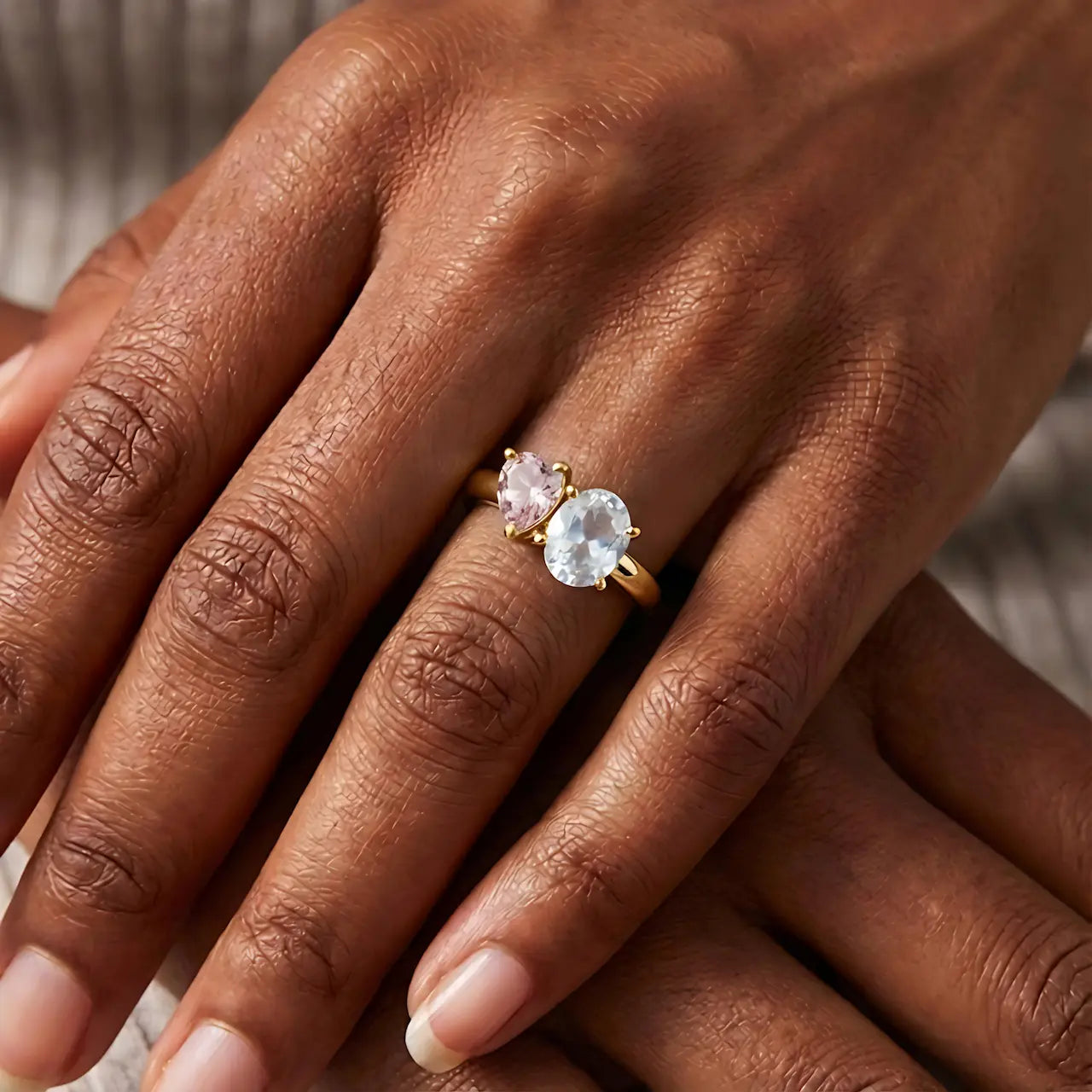 The smooth band gives the ring a calm and balanced form. A moonstone and a morganite sit side by side, their gentle contrast adding a quiet depth to the design. The stones are set with light, refined prongs that keep the piece airy and subtle. This ring carries a quiet warmth, offering a sense of ease and helping you stay close to your own steady rhythm.