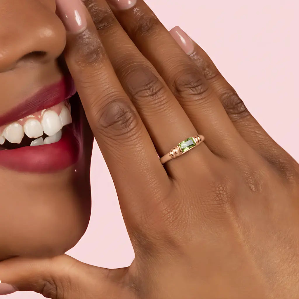 Our peridot baguette ring features a smooth and comfortable band with a dazzling peridot set at its center. The gemstone's clear green hue lends the ring a serene and minimalist beauty. As the birthstone for August, peridot symbolizes empathy. It encourages gentle understanding of others, adding warmth to everyday life. This ring serves as a constant reminder to stay connected with those who care about you.