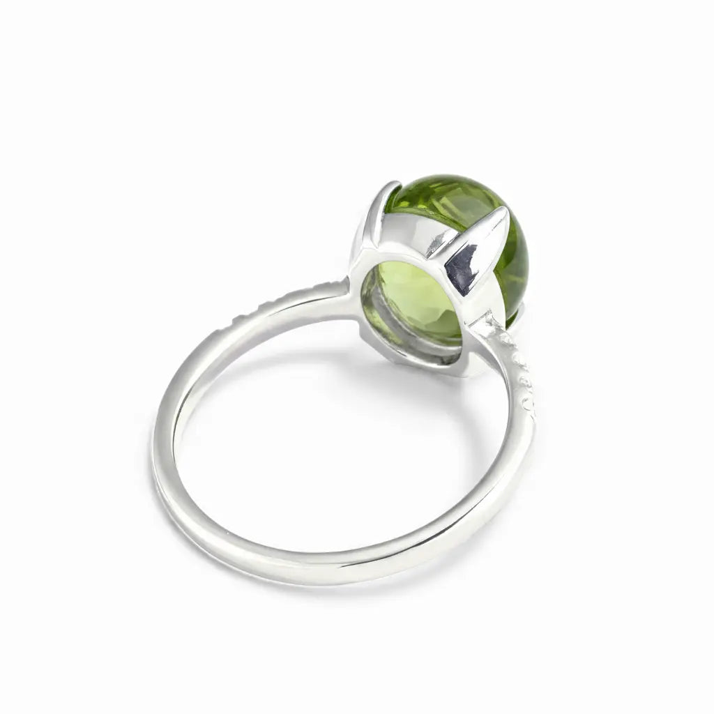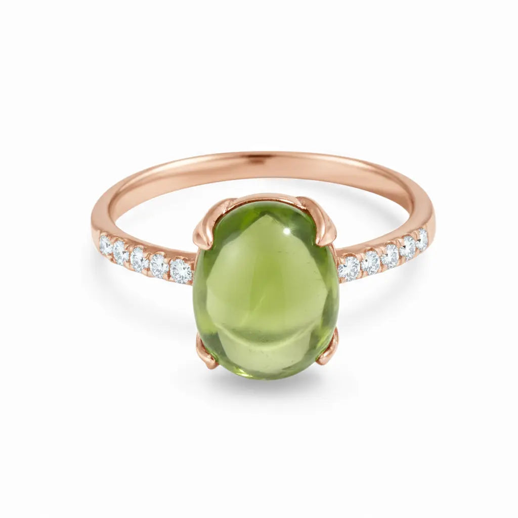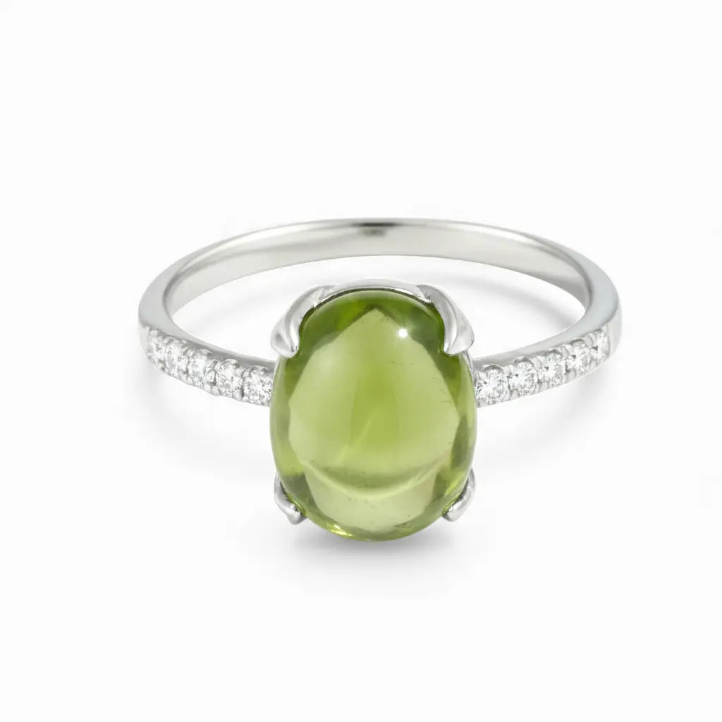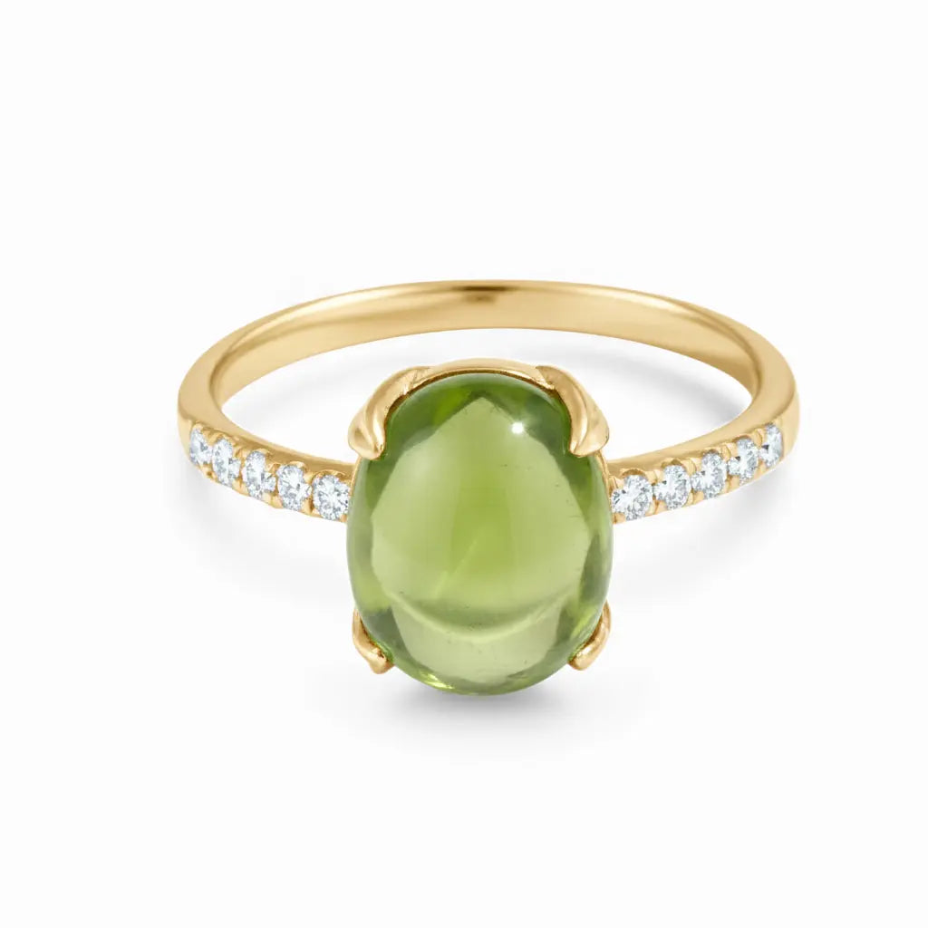 Like a ray of green light gently enveloped by sunlight, the cabochon-shaped peridot shimmers softly on your finger. The ring's color carries a quiet strength, gentle yet firm. Symbolizing empathy, it teaches you to understand and be understood. The birthstone for August, like a warm heart, accompanies you through every moment of life.