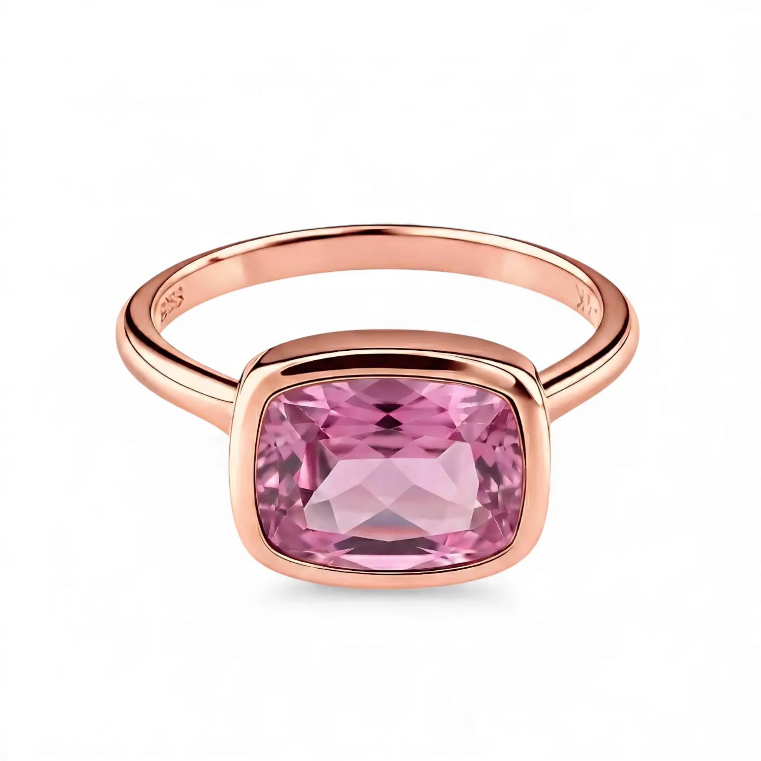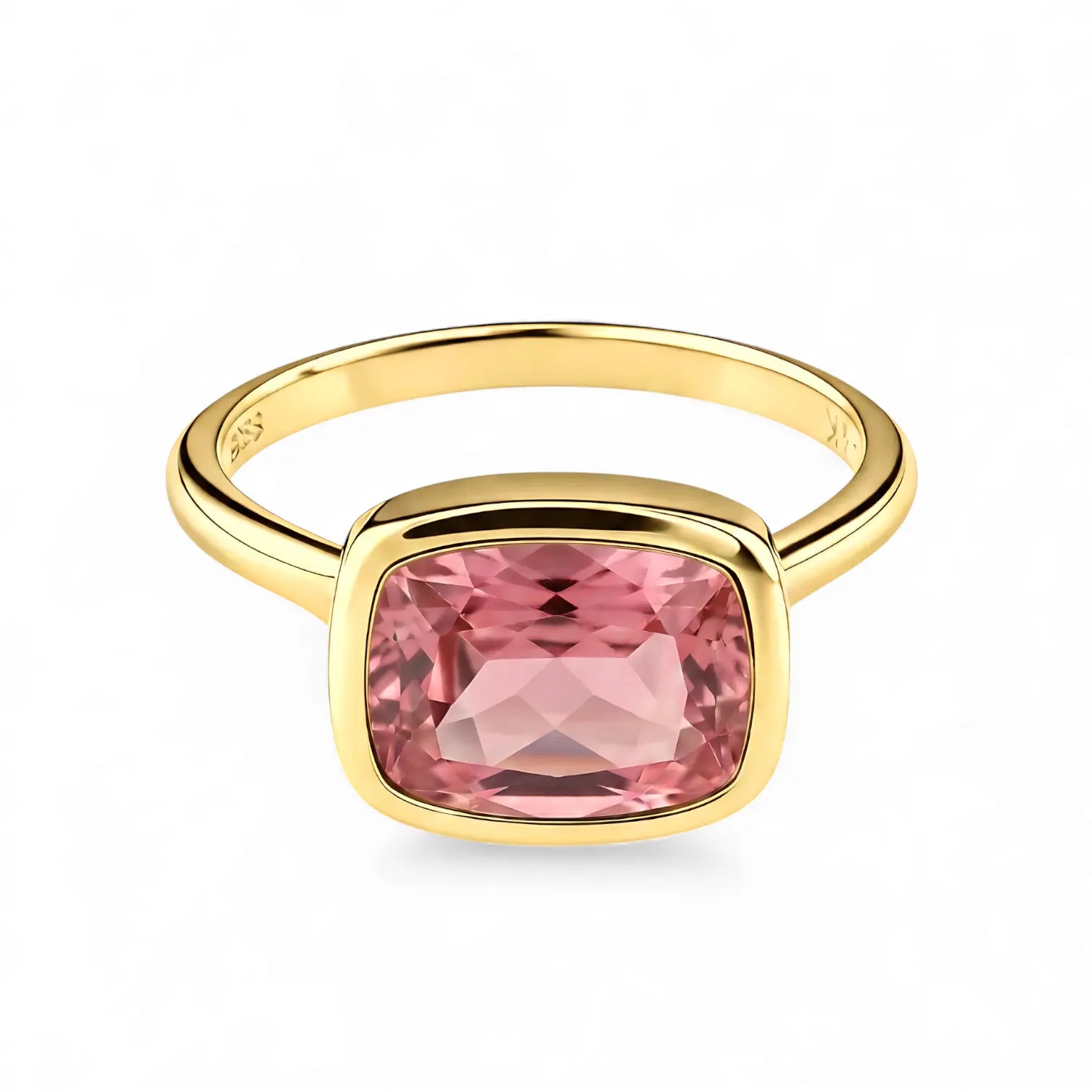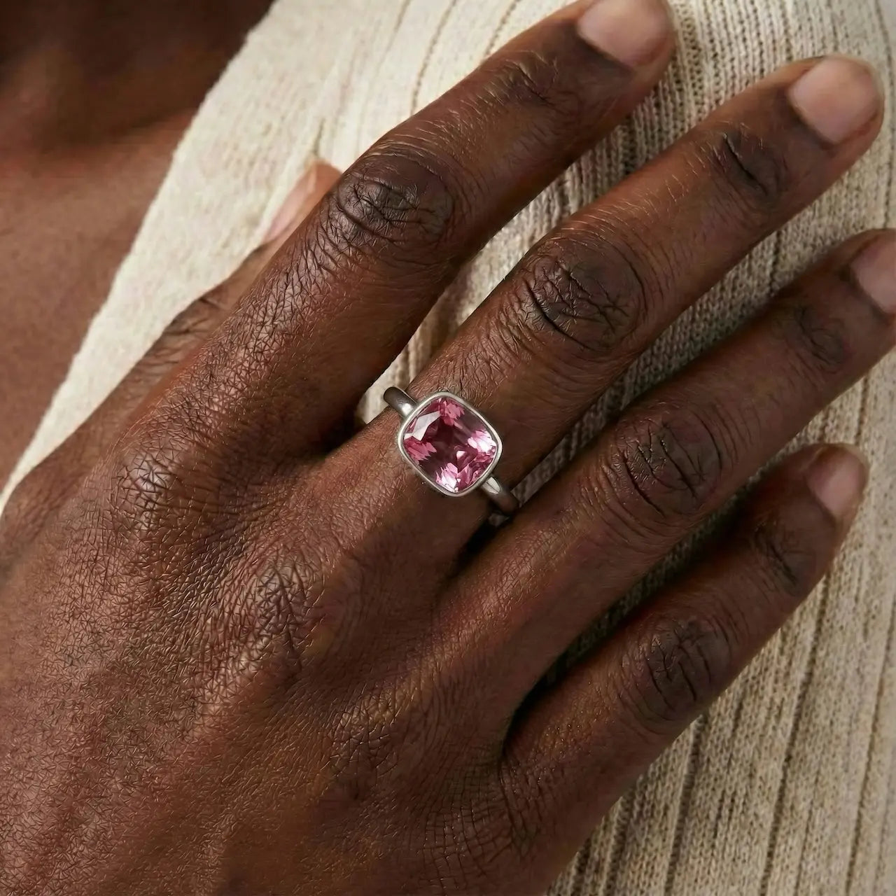 This cushion-cut ring features a gentle pink tourmaline with a clear pink tone and a touch of warmth. It serves as a gentle guardian of love, helping you open your heart to others while treating yourself with greater kindness. Every day irritations ease quietly under this blush of pink. Keep it close at your fingertips and welcome more love into your daily life.