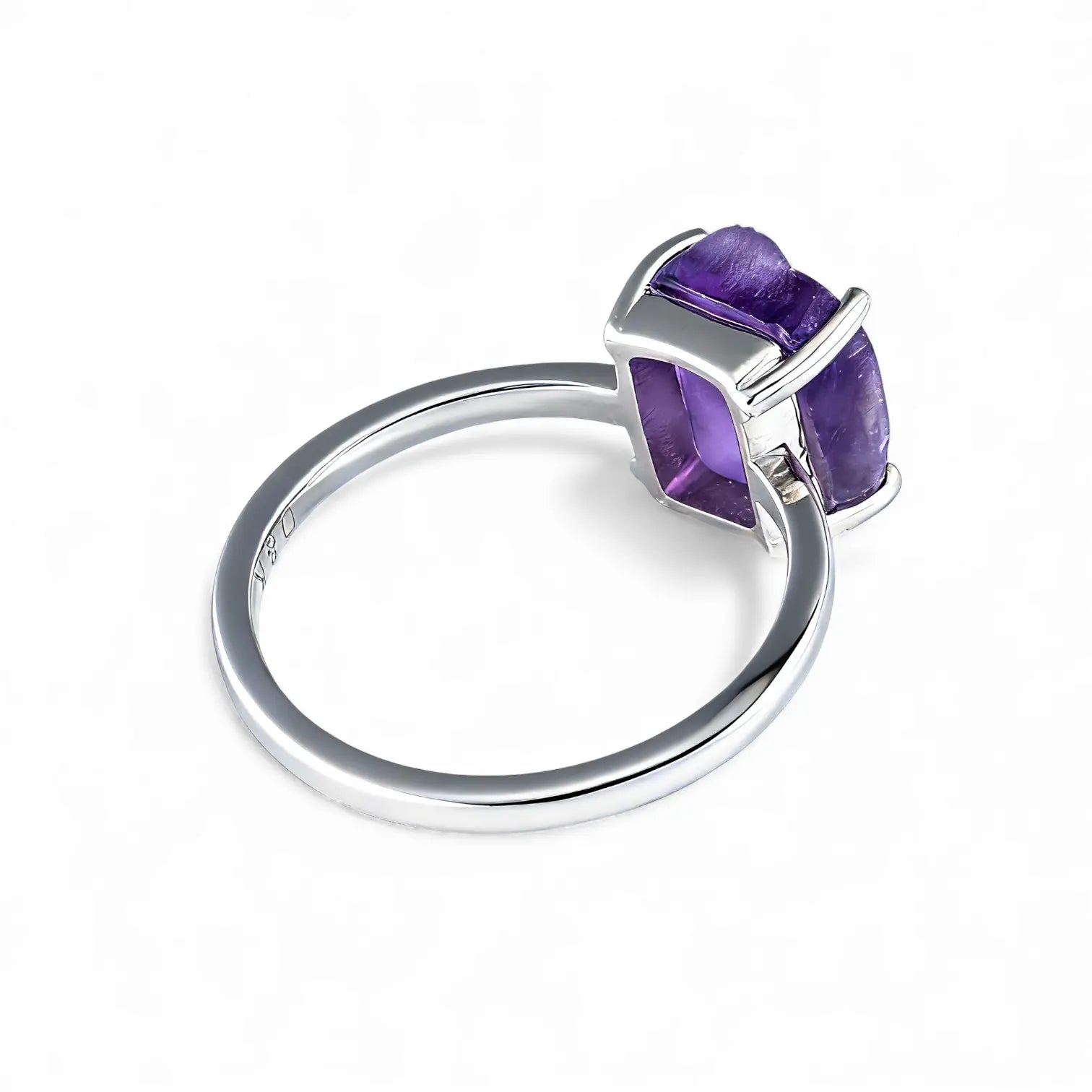 Centered around an unpolished amethyst, this ring evokes the tranquility of February, gently resting on your finger. The flowing purple veins, imbued with Amethyst's signature tranquility, soothe the soul. The smooth band extends along this serene aesthetic, simple and clean, leaving your peace on your hand.