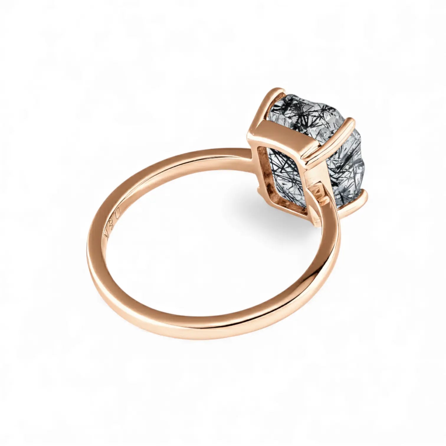 Like a transparent fragment blown by the night breeze, fine lines of black intertwine quietly within. The black rutilated quartz gemstone on your finger seems to be helping you organize your thoughts. Its cleansing comes with a natural sense of ease, and lets the mind open little by little. When you need some space for yourself, this ring offers a gentle way to clear the scattered thoughts around you.