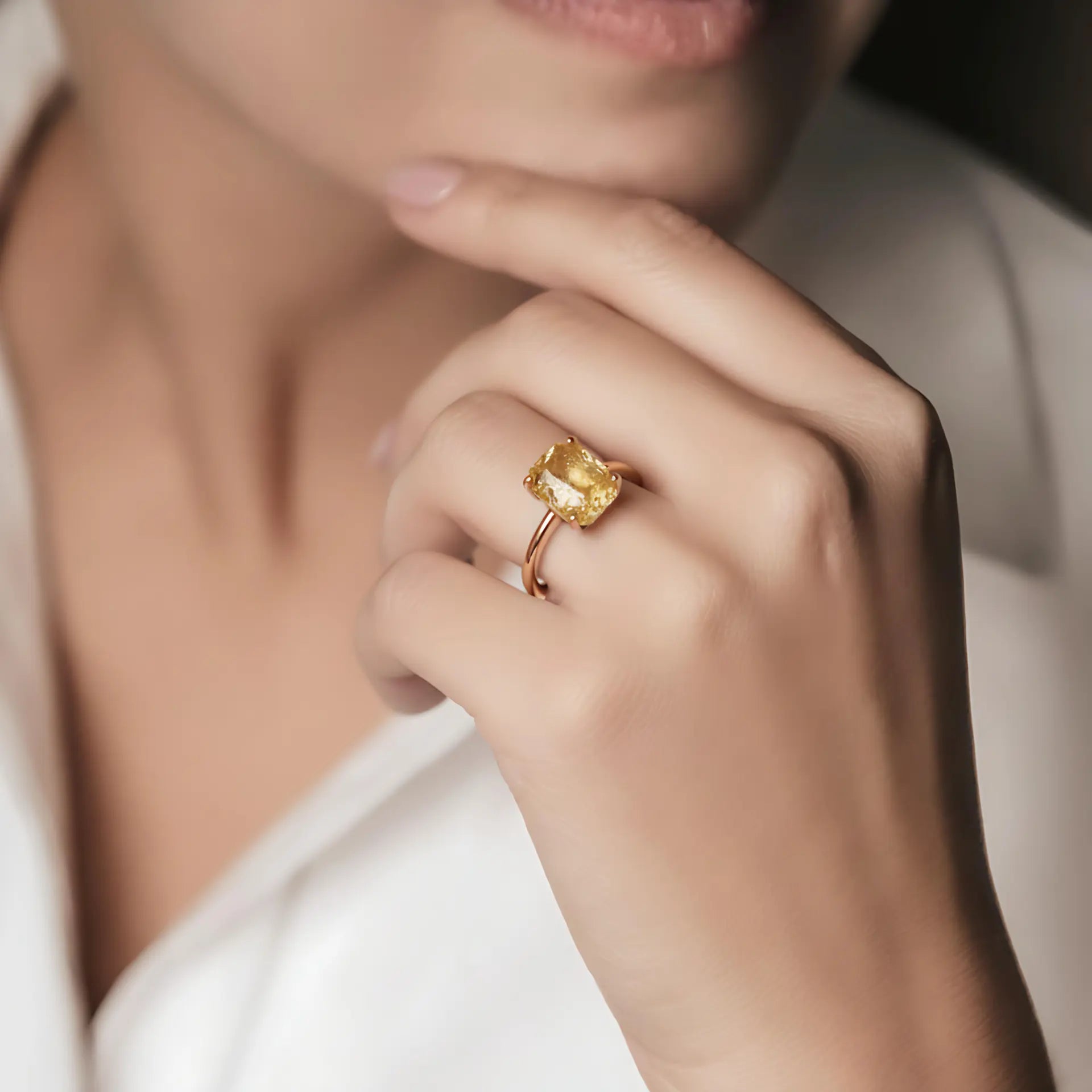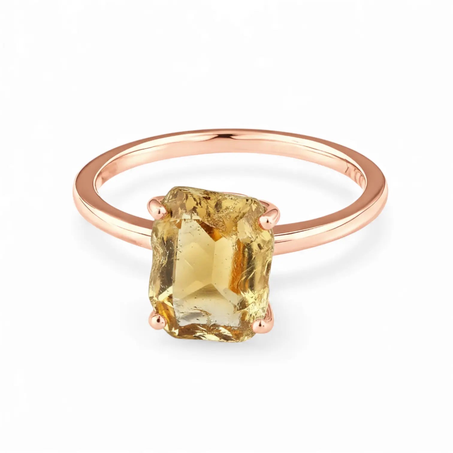 Our rough citrine ring radiates a warm yellow light, like the afternoon sun in November gently falling on your finger. Your state of mind grows brighter, and even ordinary days hold a sense of fullness and warmth. The simple band holds this golden brilliance, like warmth being caught in the palm of your hand. May this gentle warmth of gold accompany you towards a more abundant life.