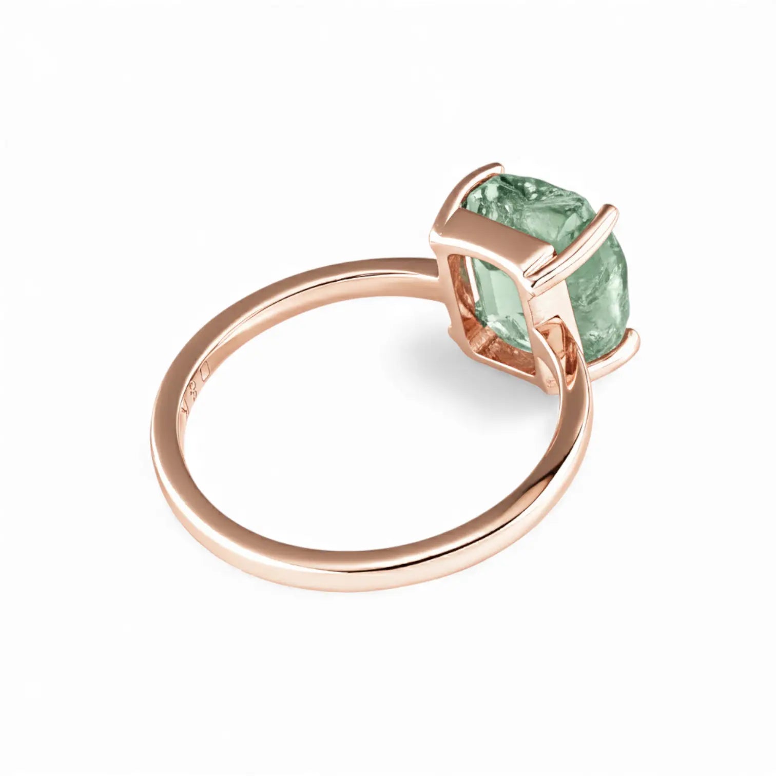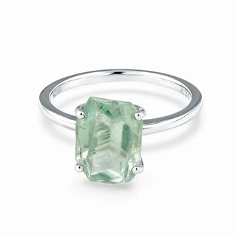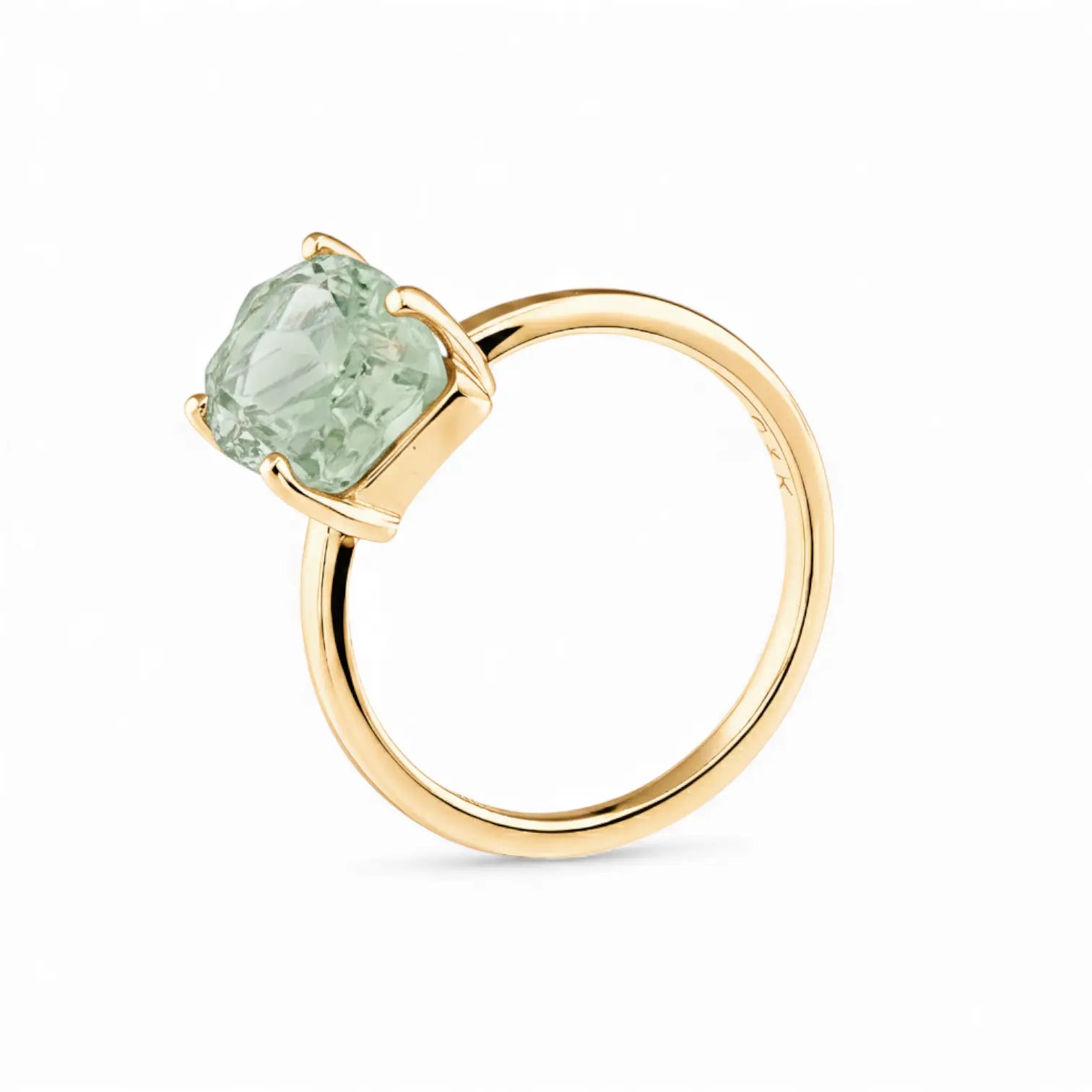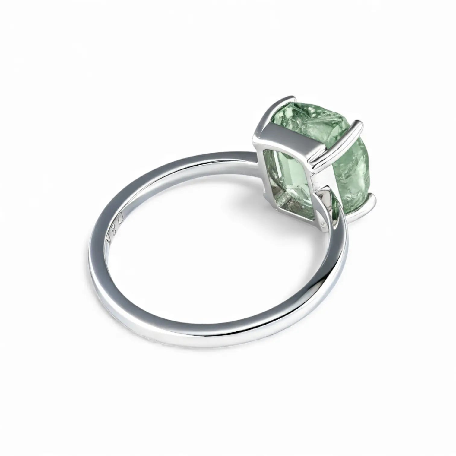 The pale green of green amethyst feels like a lake touched by early morning wind. Natural in form and effortless in spirit, the raw shape carries a soft yet steady strength. Its energy settles on your finger and lowers the noise of daily life, so the rhythm inside you returns to harmony. If you want to keep this softness with you, let this Raw Green Amethyst Ring join you on the way.