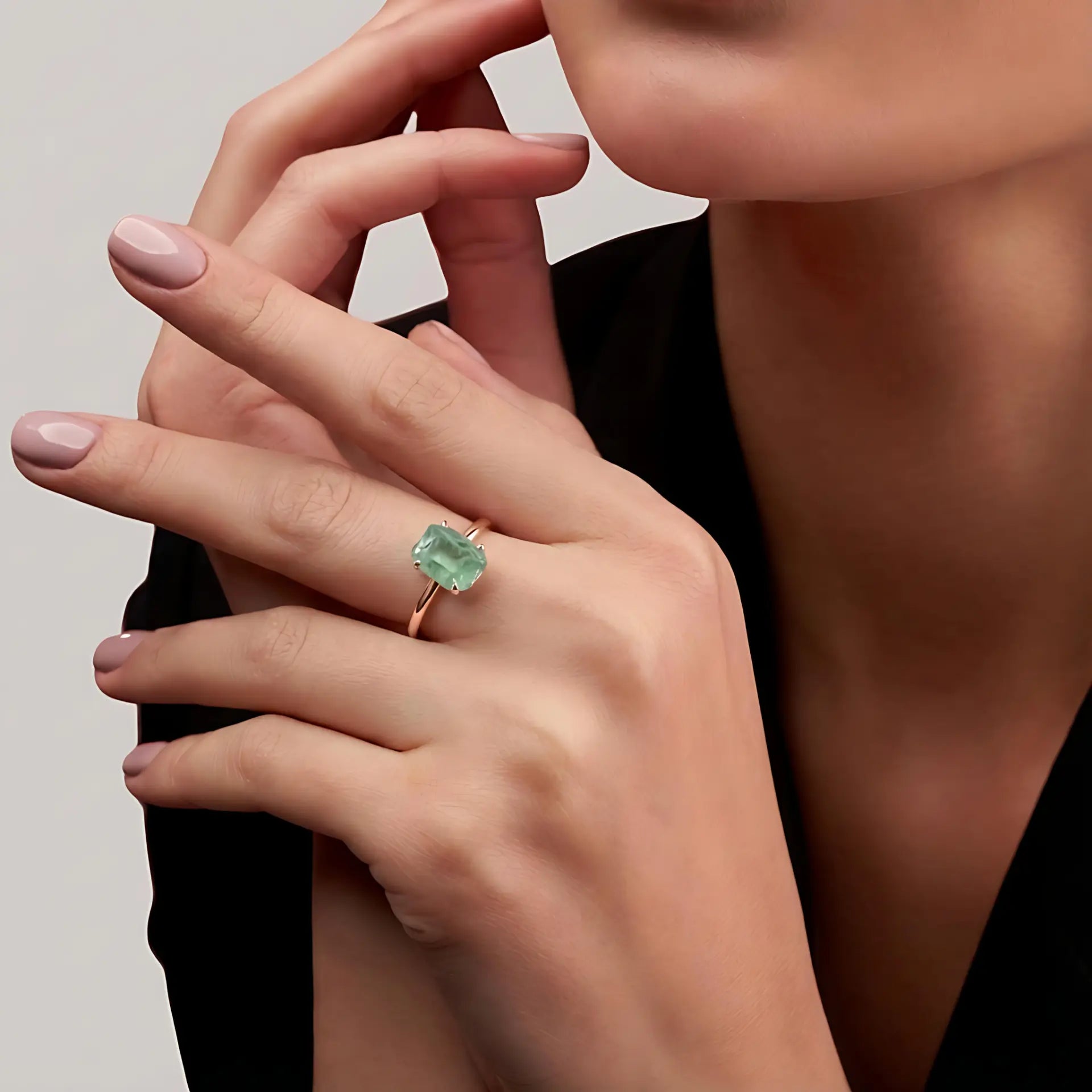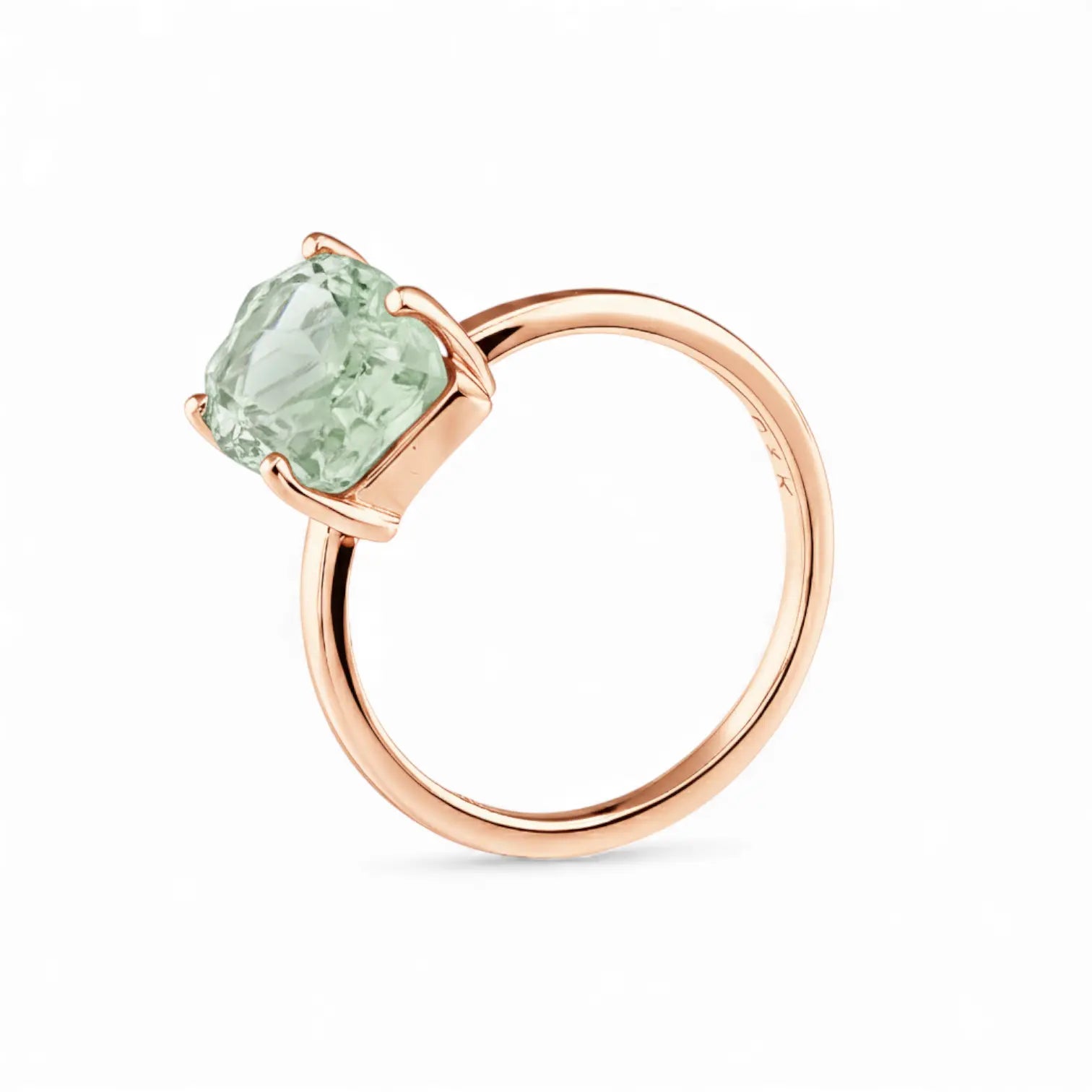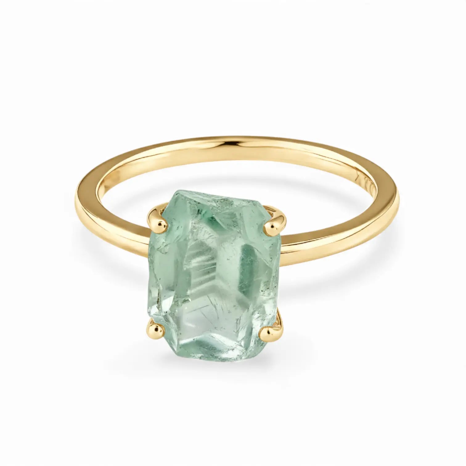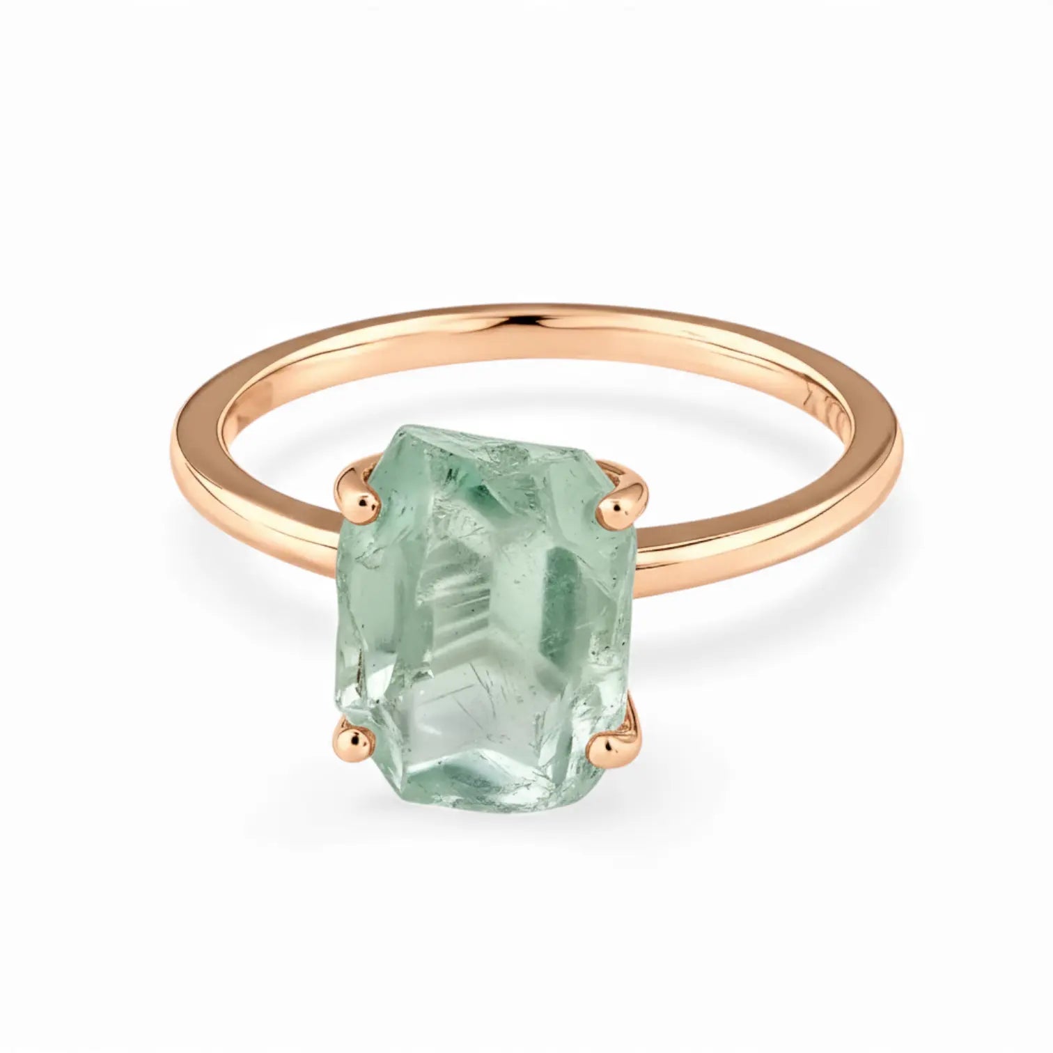 The pale green of green amethyst feels like a lake touched by early morning wind. Natural in form and effortless in spirit, the raw shape carries a soft yet steady strength. Its energy settles on your finger and lowers the noise of daily life, so the rhythm inside you returns to harmony. If you want to keep this softness with you, let this Raw Green Amethyst Ring join you on the way.