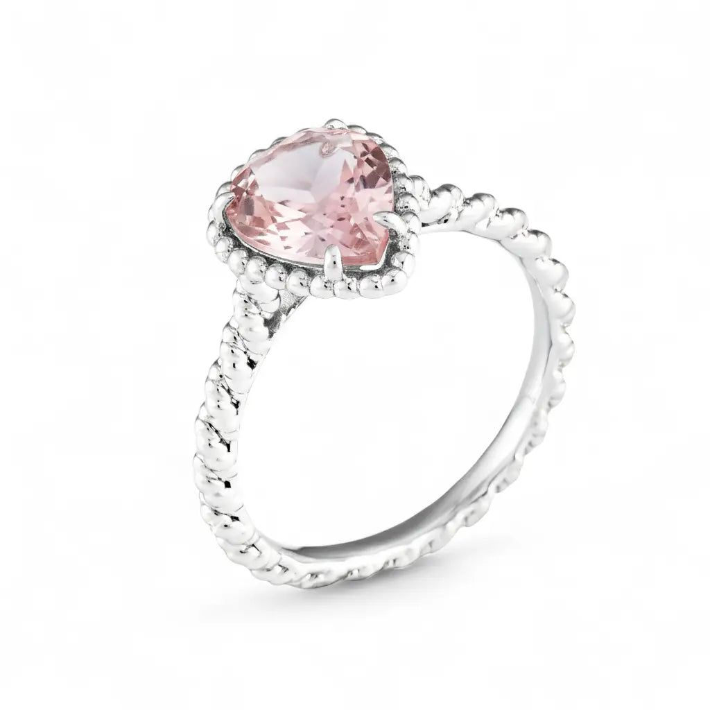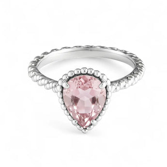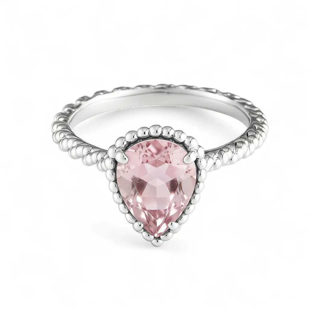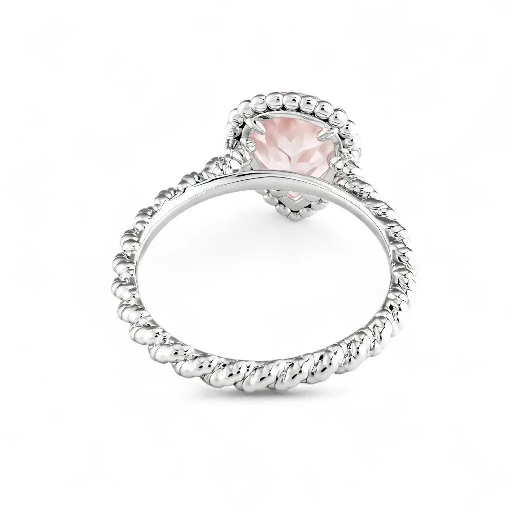 This rose quartz ring captures a gentle flow with its delicate pear-shaped cut. A misty halo diffuses across the finger, like a soft embrace. The twisted band as if time itself pauses for a tender moment.