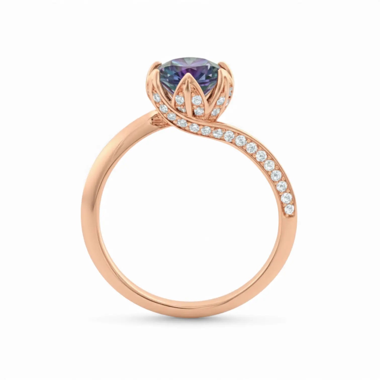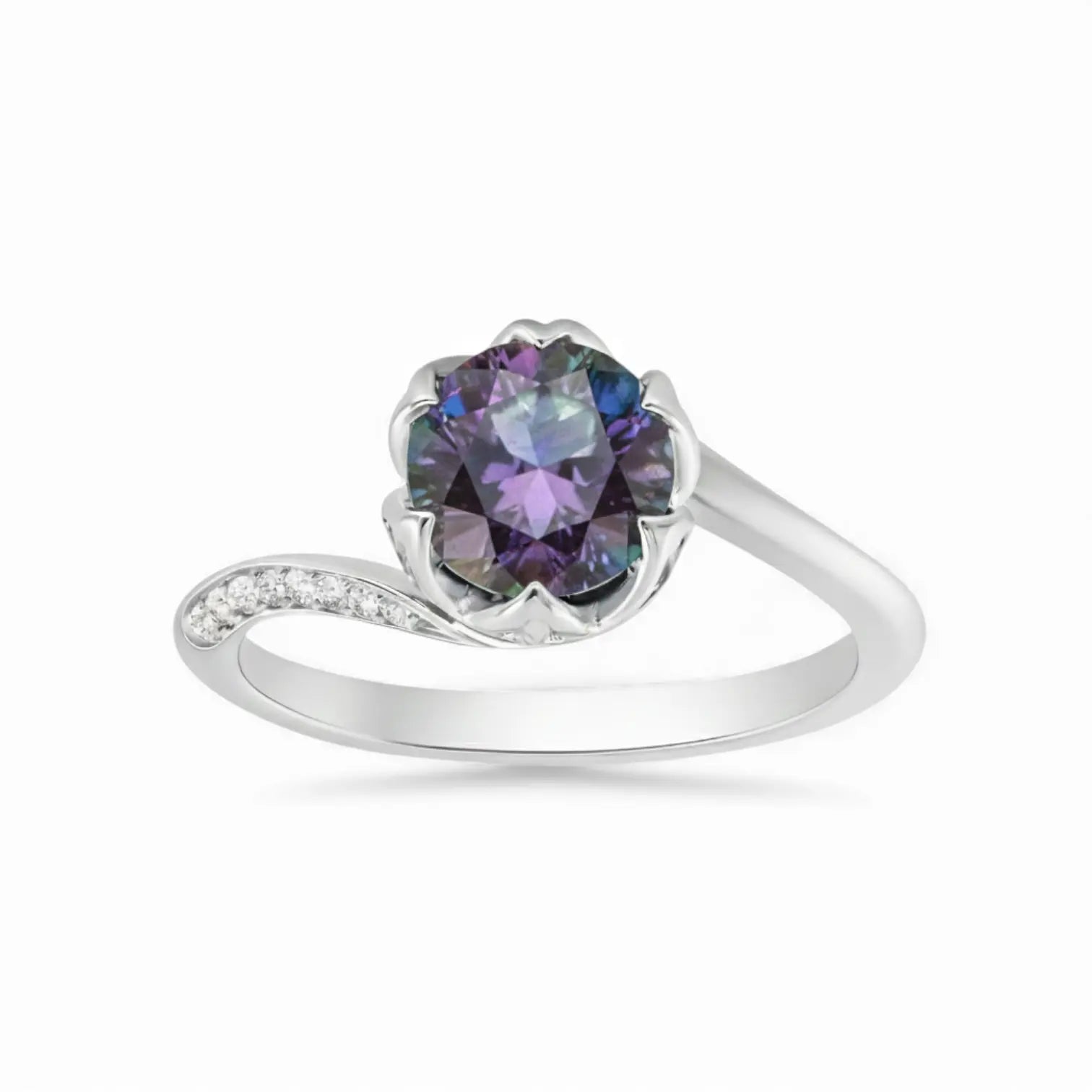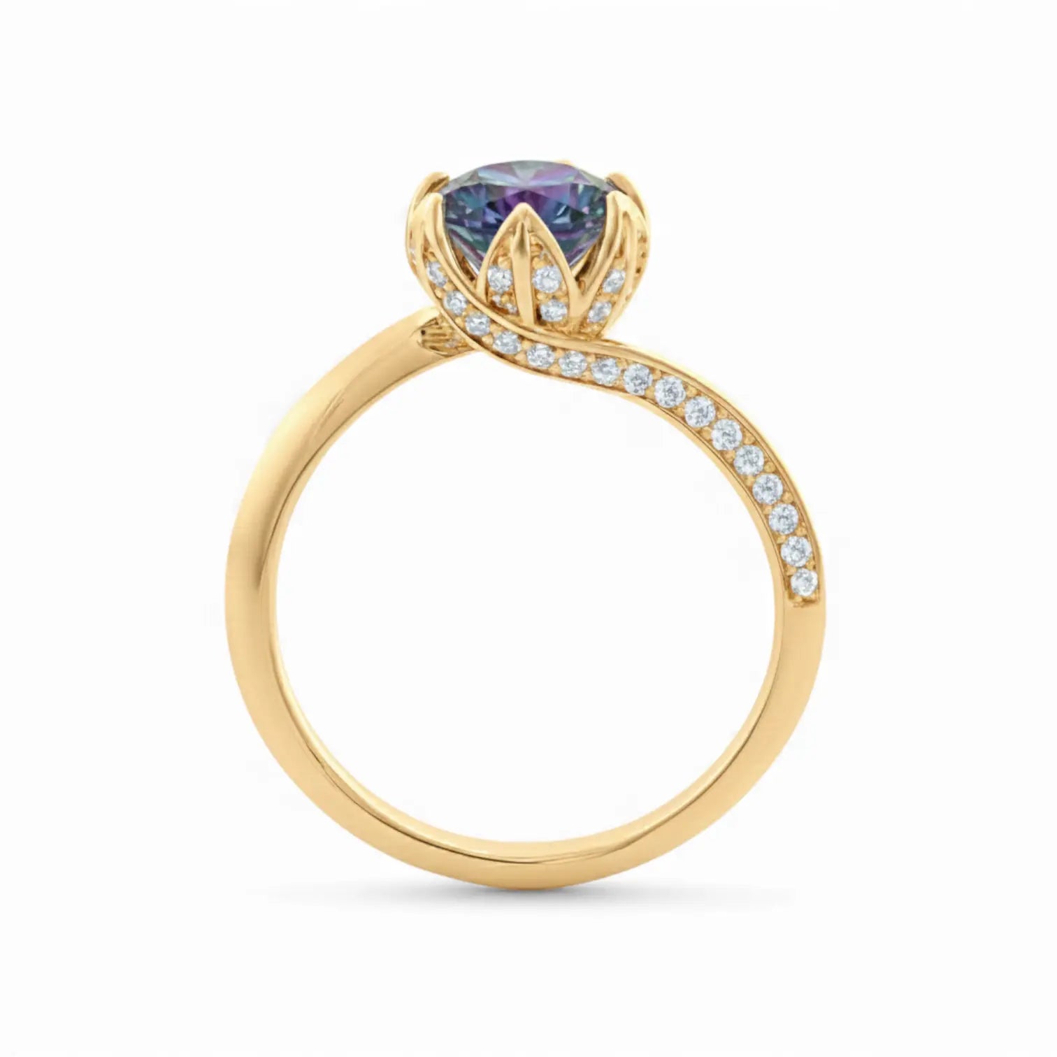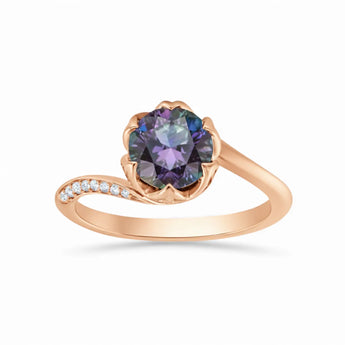In the center of the floral prong setting, a round Alexandrite shows its changing hues in the light. Each shift brings a small sense of surprise. Along one side, small zircon stones draw a delicate trail of shimmer that plays beautifully against the stone’s shifting colors. Wear it, and you’ll sense how life’s gentle pauses make even the slightest changes more visible.