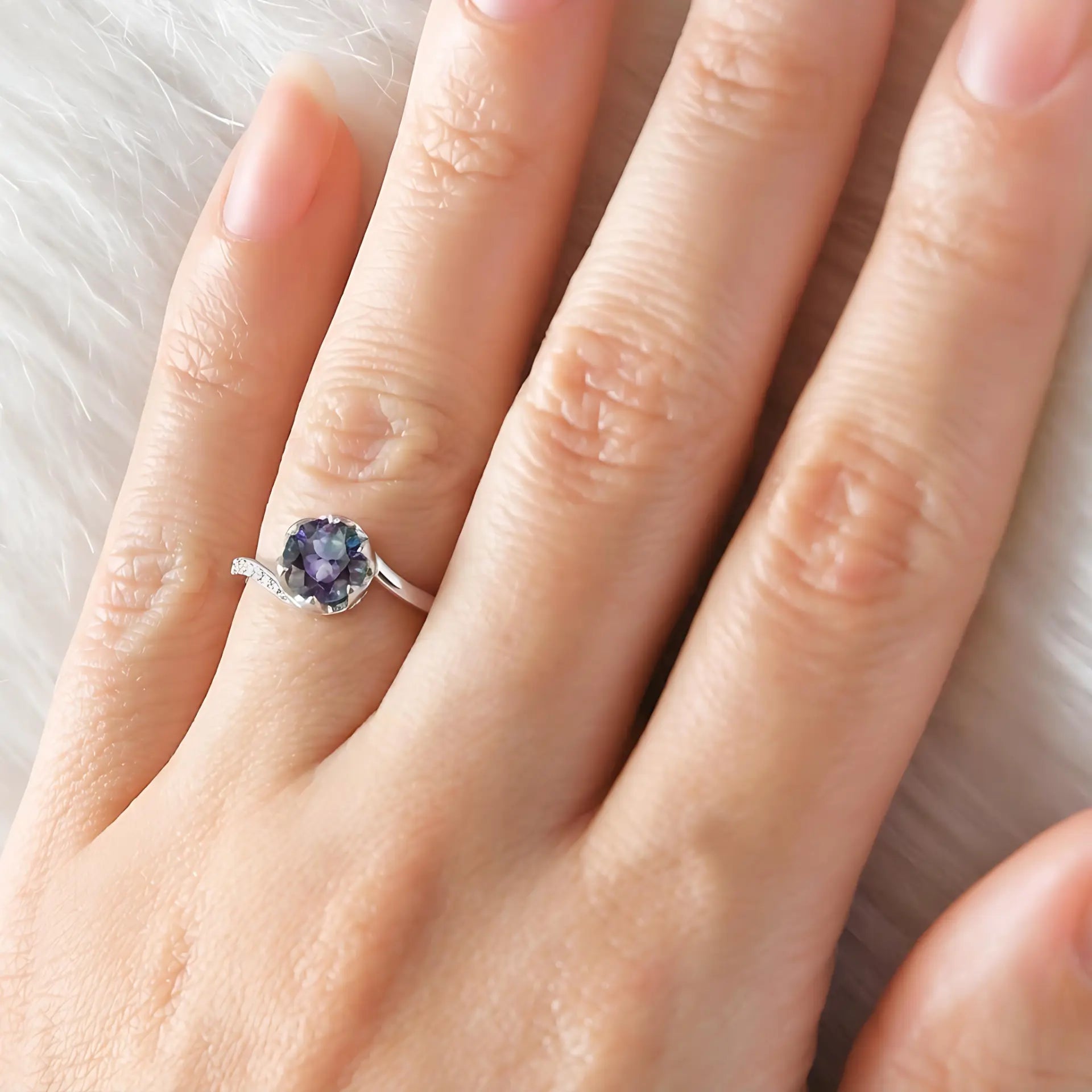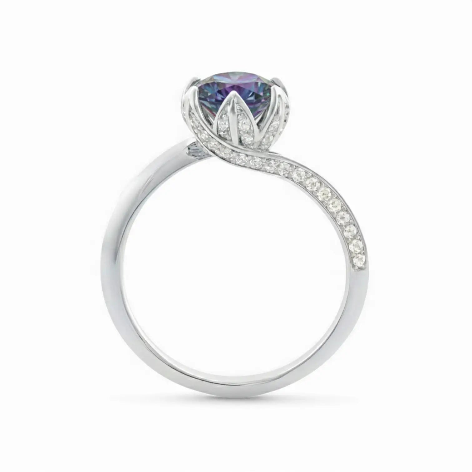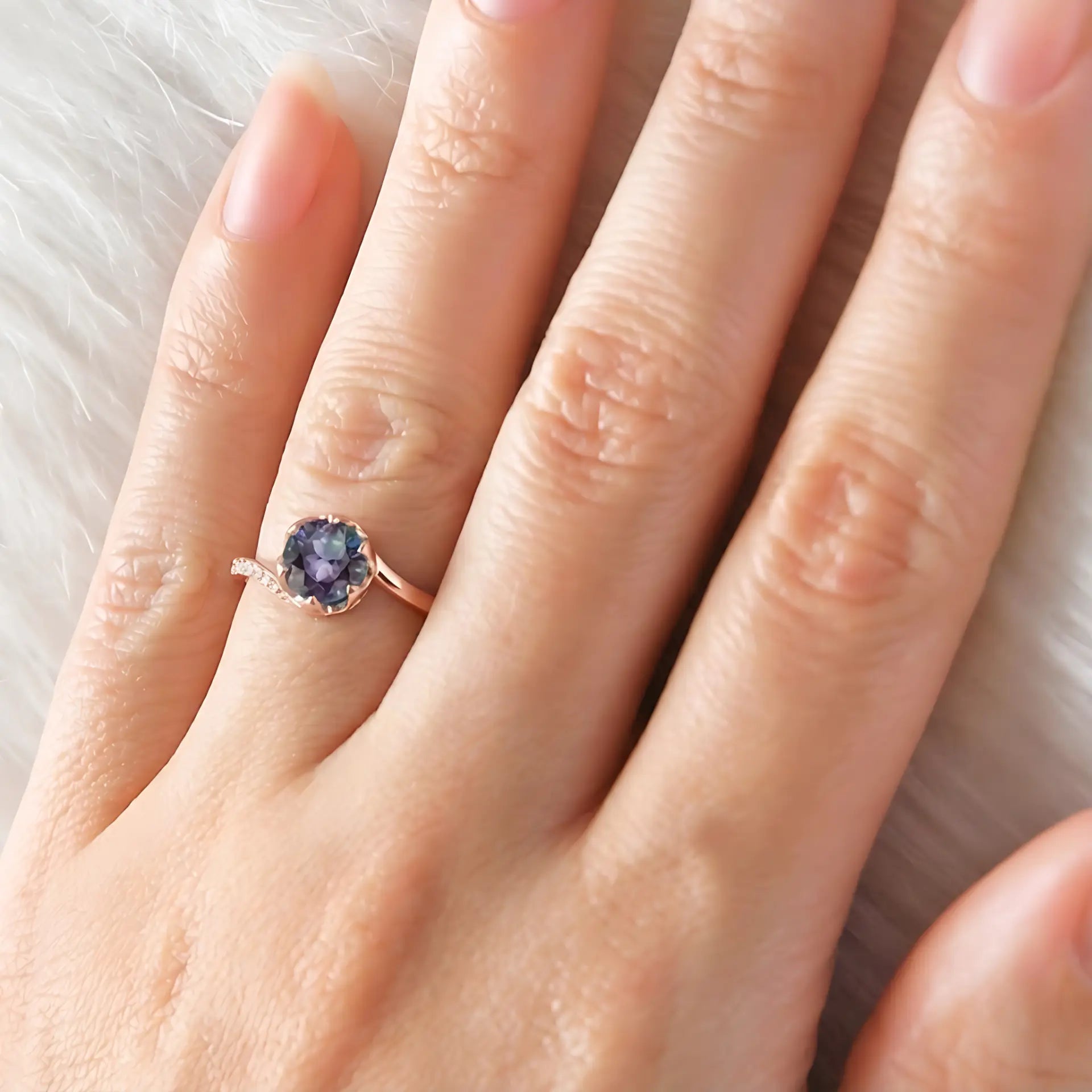 In the center of the floral prong setting, a round Alexandrite shows its changing hues in the light. Each shift brings a small sense of surprise. Along one side, small zircon stones draw a delicate trail of shimmer that plays beautifully against the stone’s shifting colors. Wear it, and you’ll sense how life’s gentle pauses make even the slightest changes more visible.