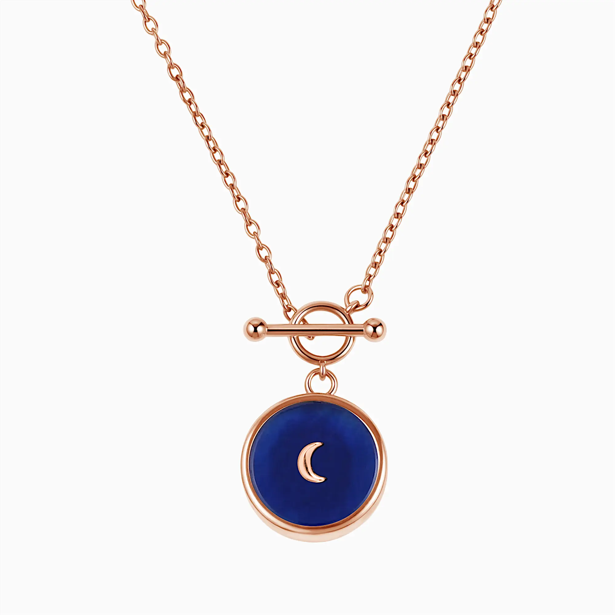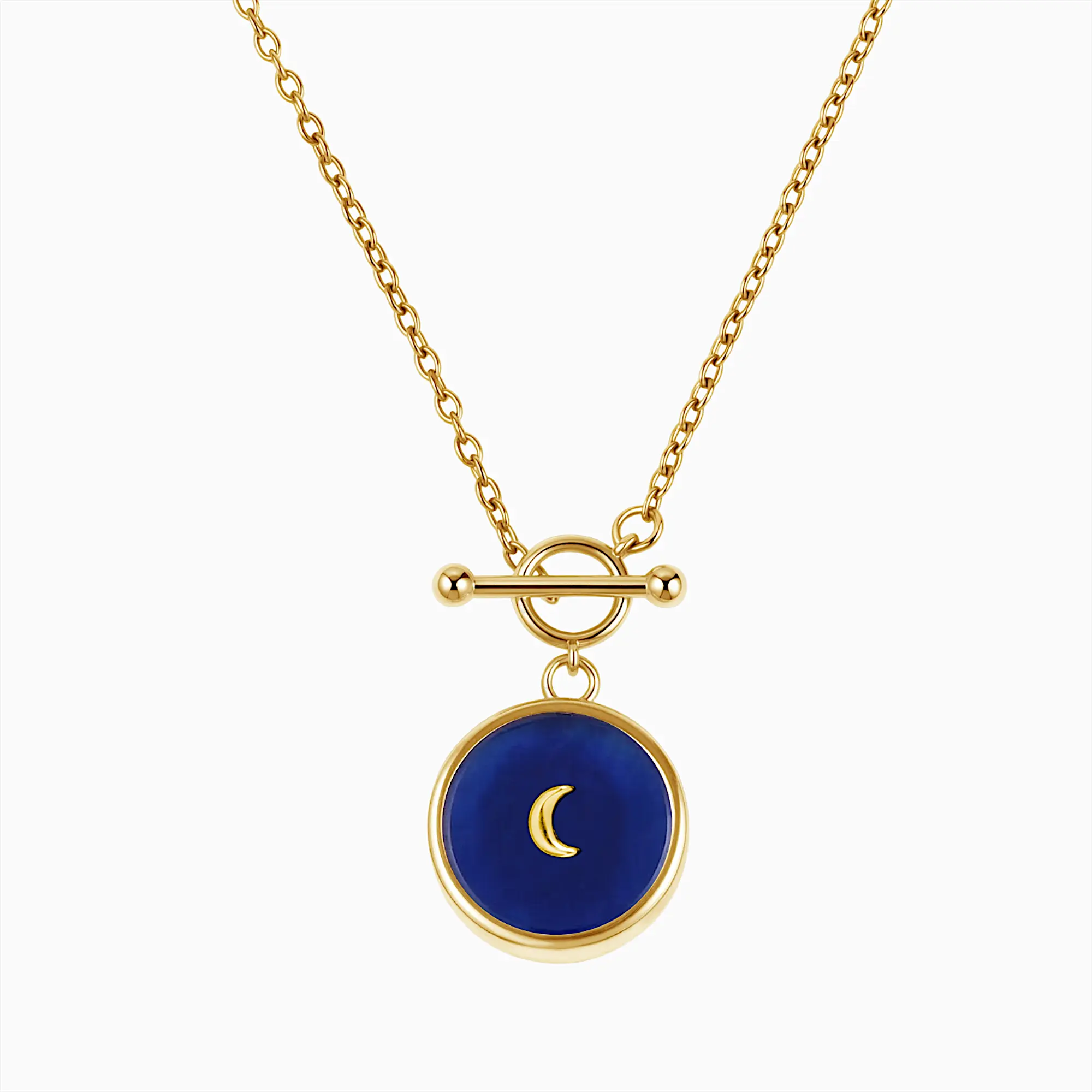 A distinctive toggle clasp forms a quiet circle, holding a blue sapphire where a crescent moon rests in calm blue light. This necklace carries a sense of steady presence, a gentle reminder of time, change, and quiet reassurance close to the heart.