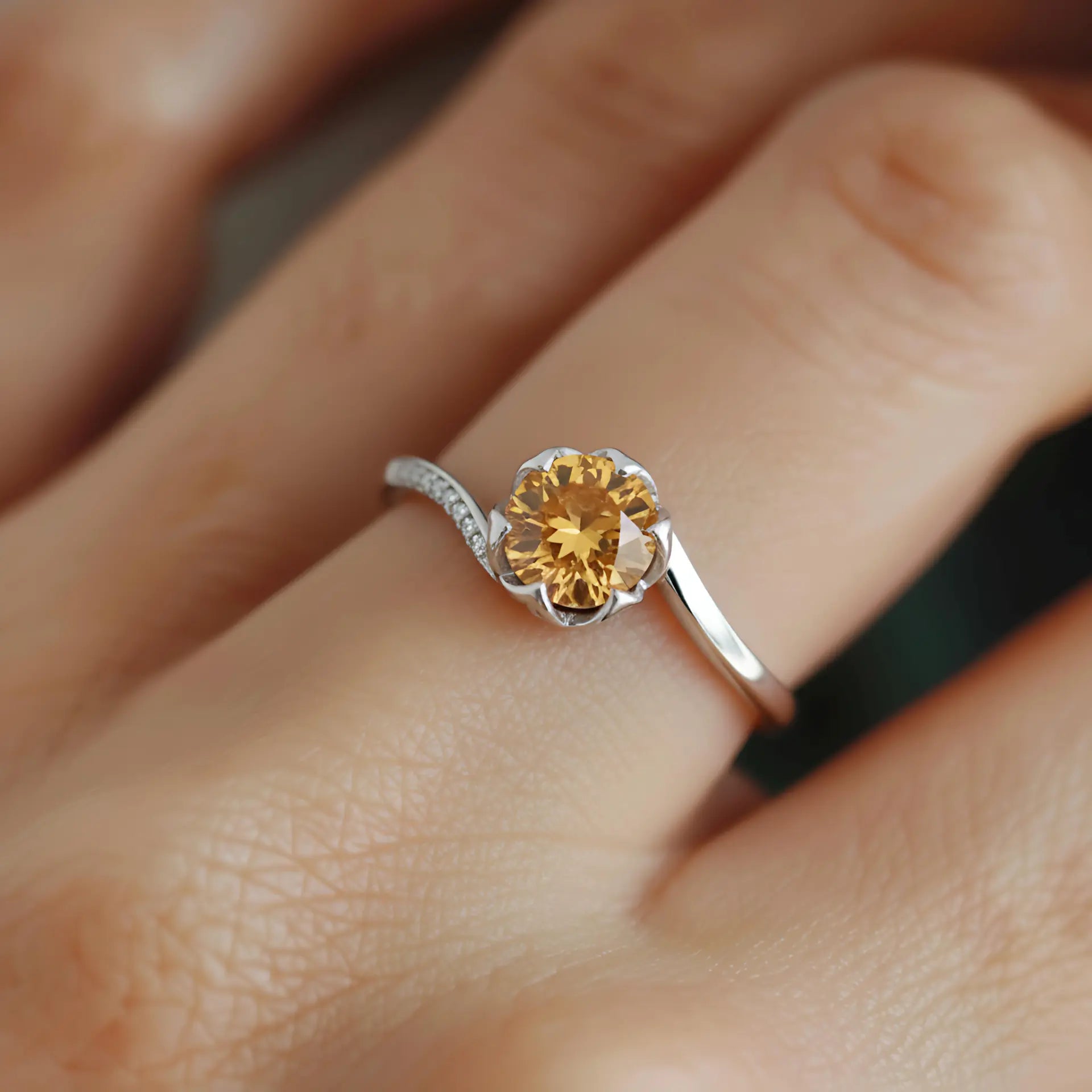 The golden citrine is lifted as if it were a captured beam of light. It does not dazzle. It simply brings warmth. Small zircon stones on the side whisper in a quiet tone. This citrine petal prong ring adds a gentle sense of ease and abundance to life. It exists for those who believe light always finds its own path. Let it stay with you in silence and allow light to enter your world.
