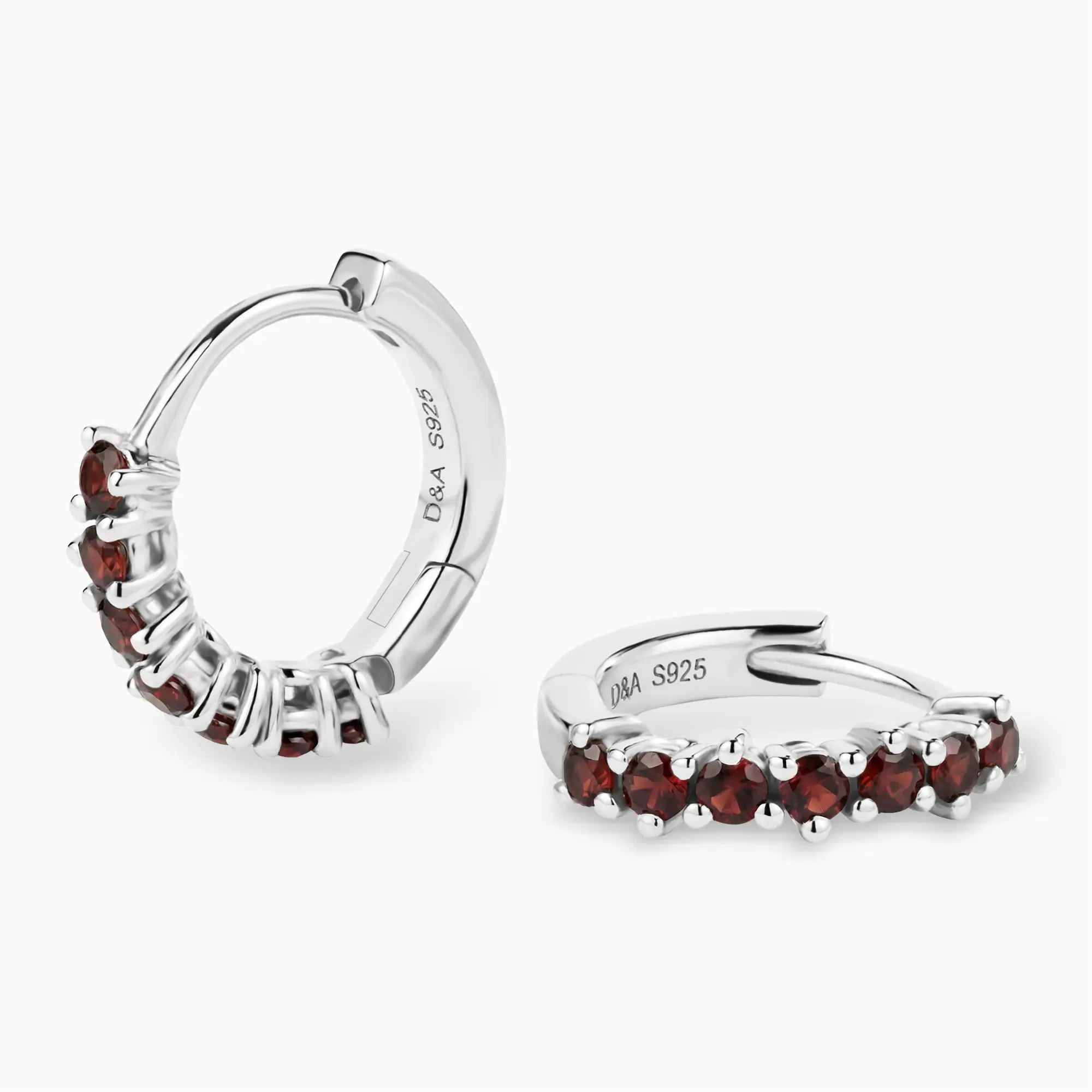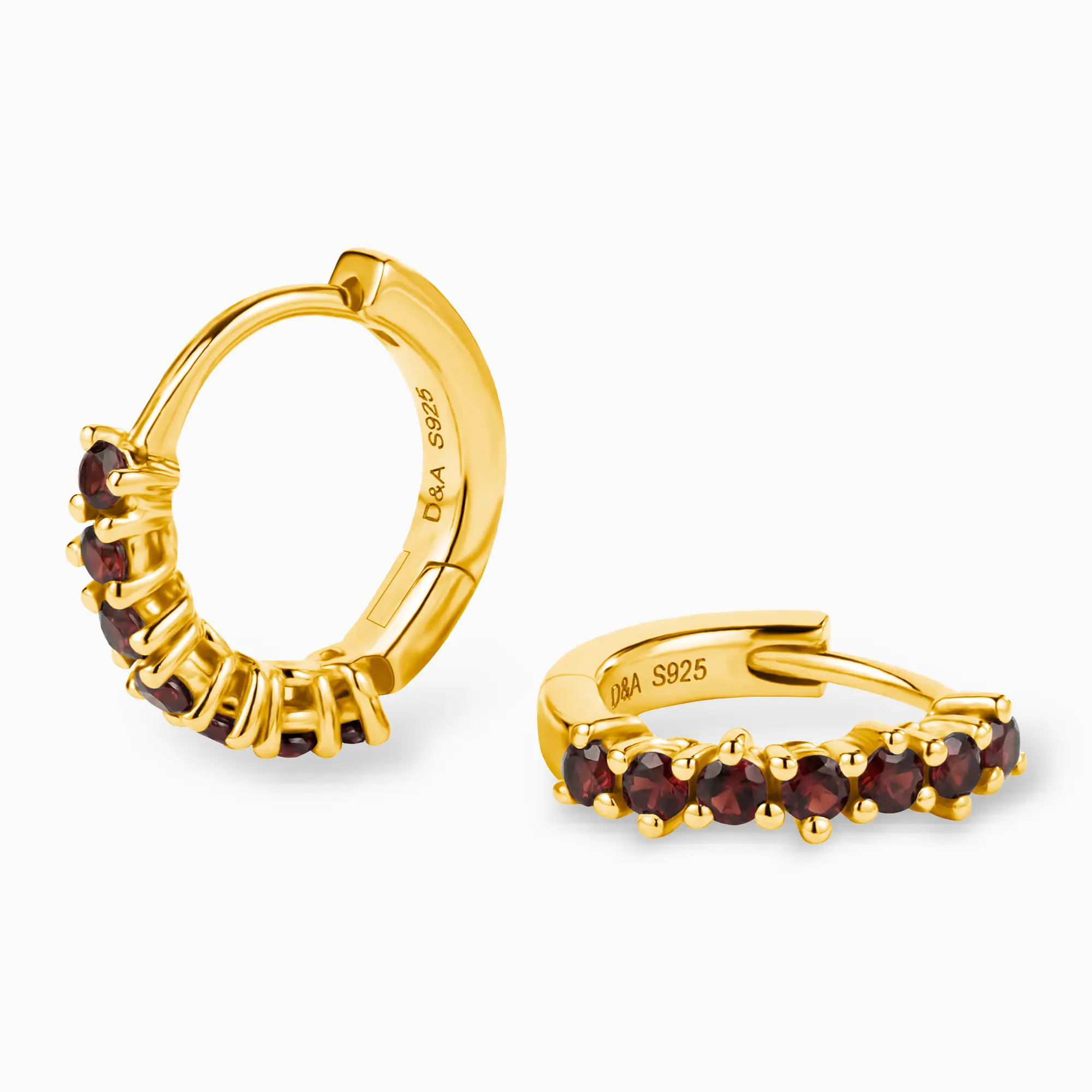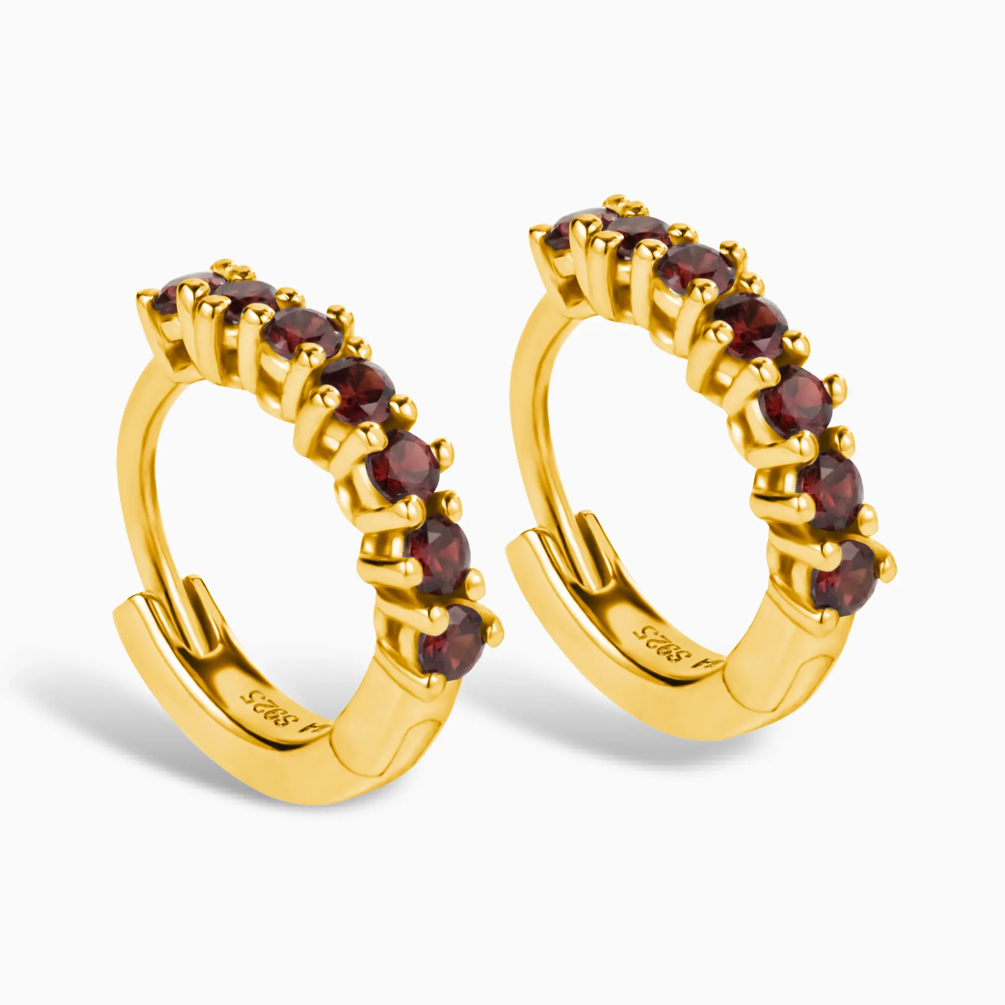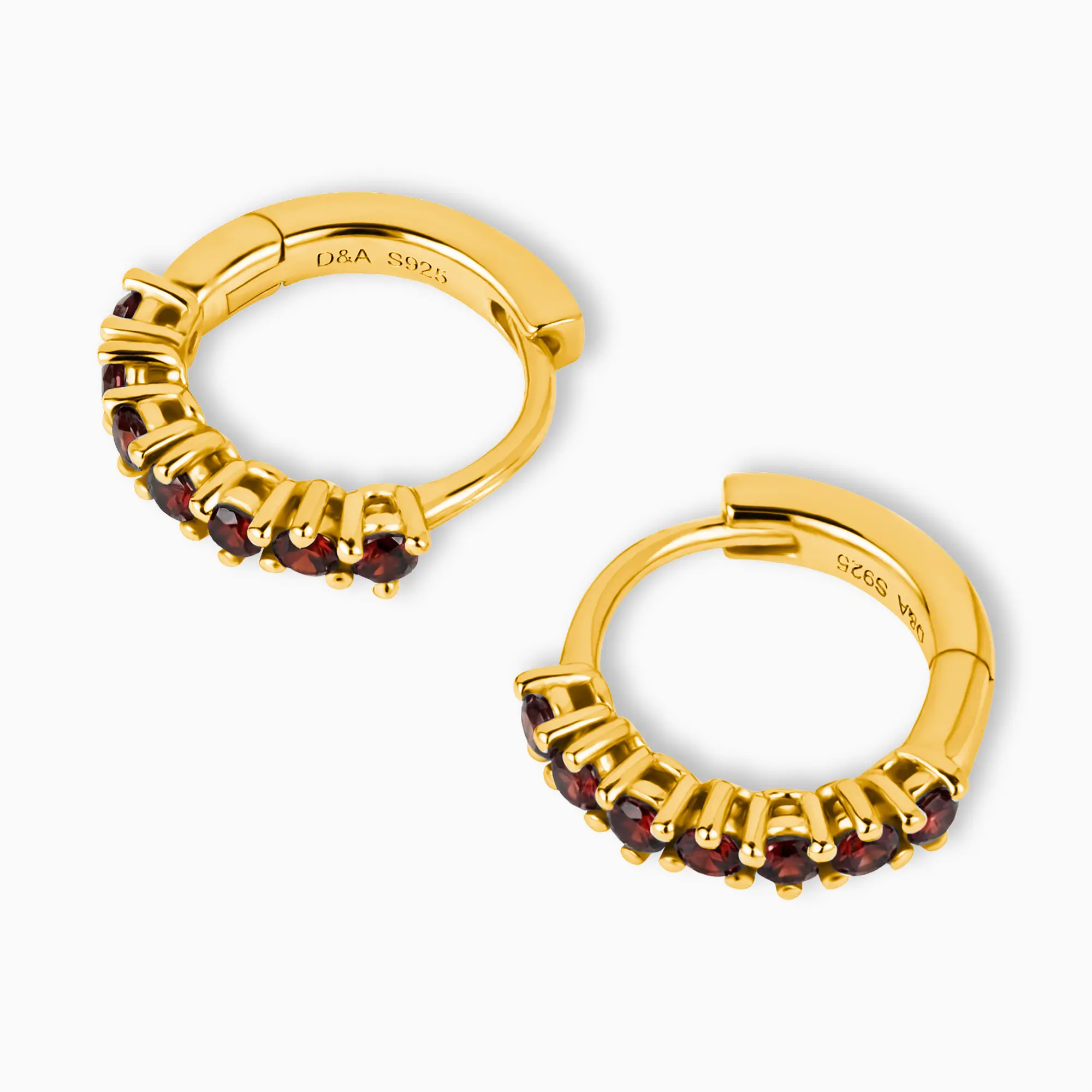 Introducing the Hushed Collection! Among them are the Round Garnet Huggie Hoop Earrings, intense and warm, awakening inner passion and energy. A semi-circle of tiny round gems arranged along the outer edge brings a subtle yet profound red luster. Wear them daily, let every day be filled with an undying spark.