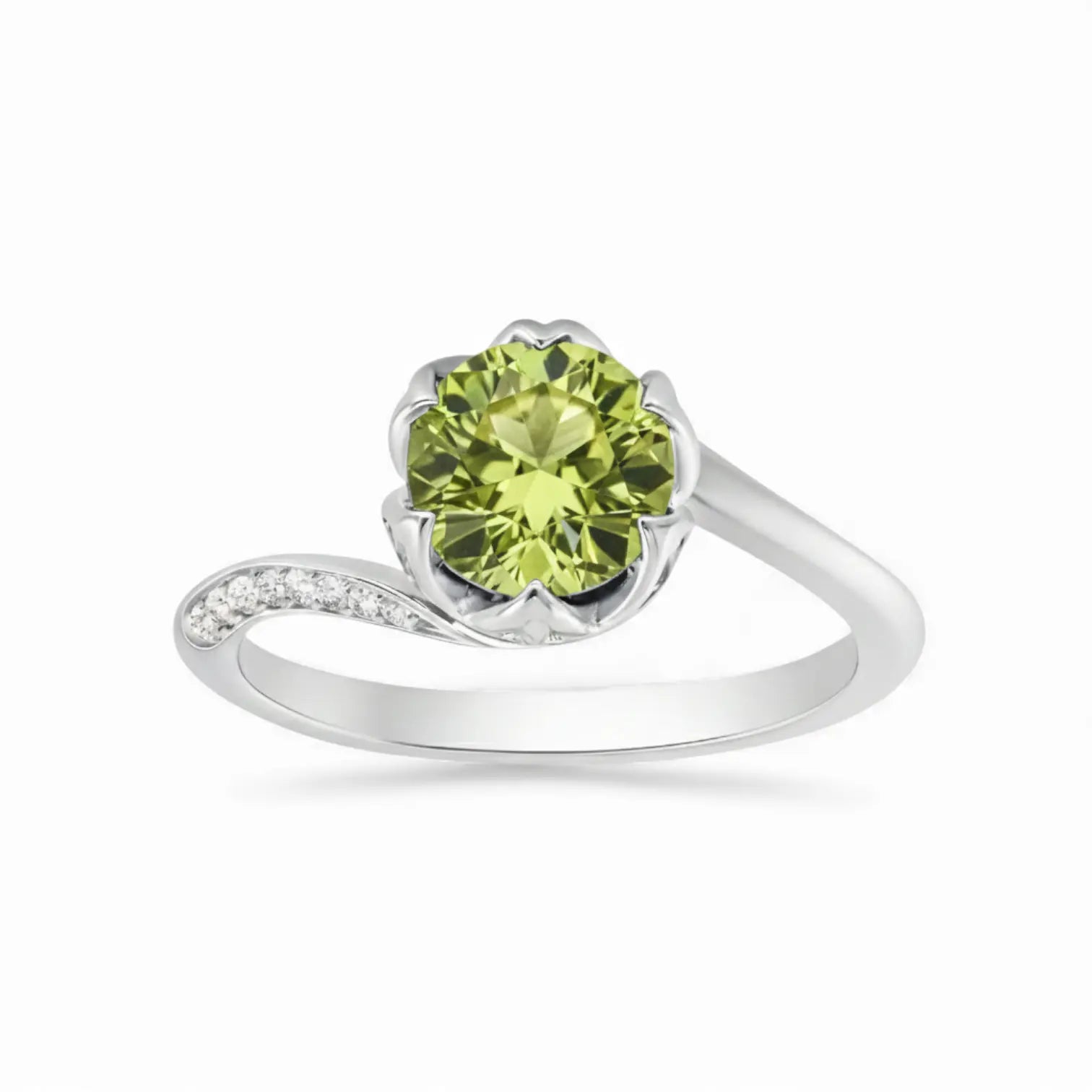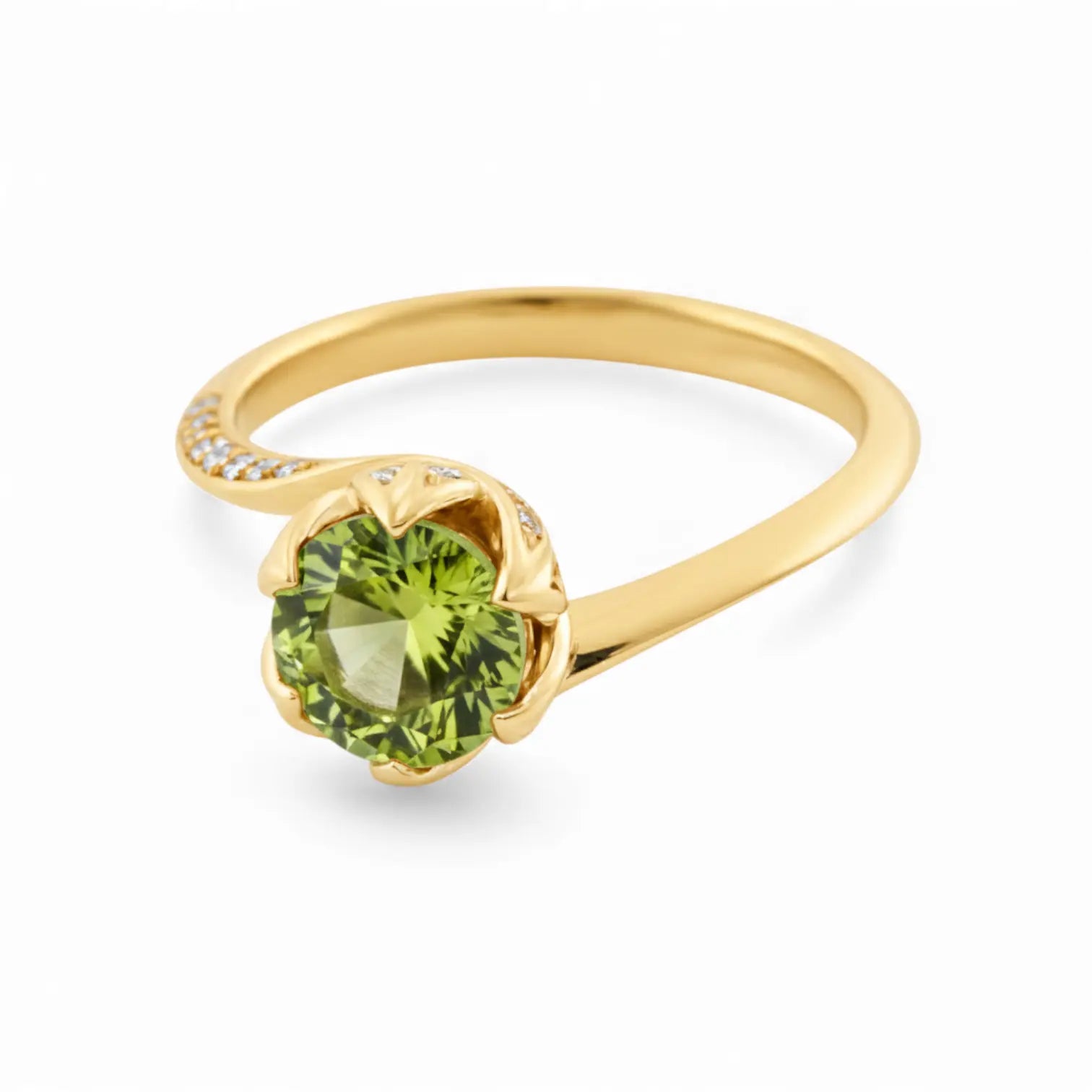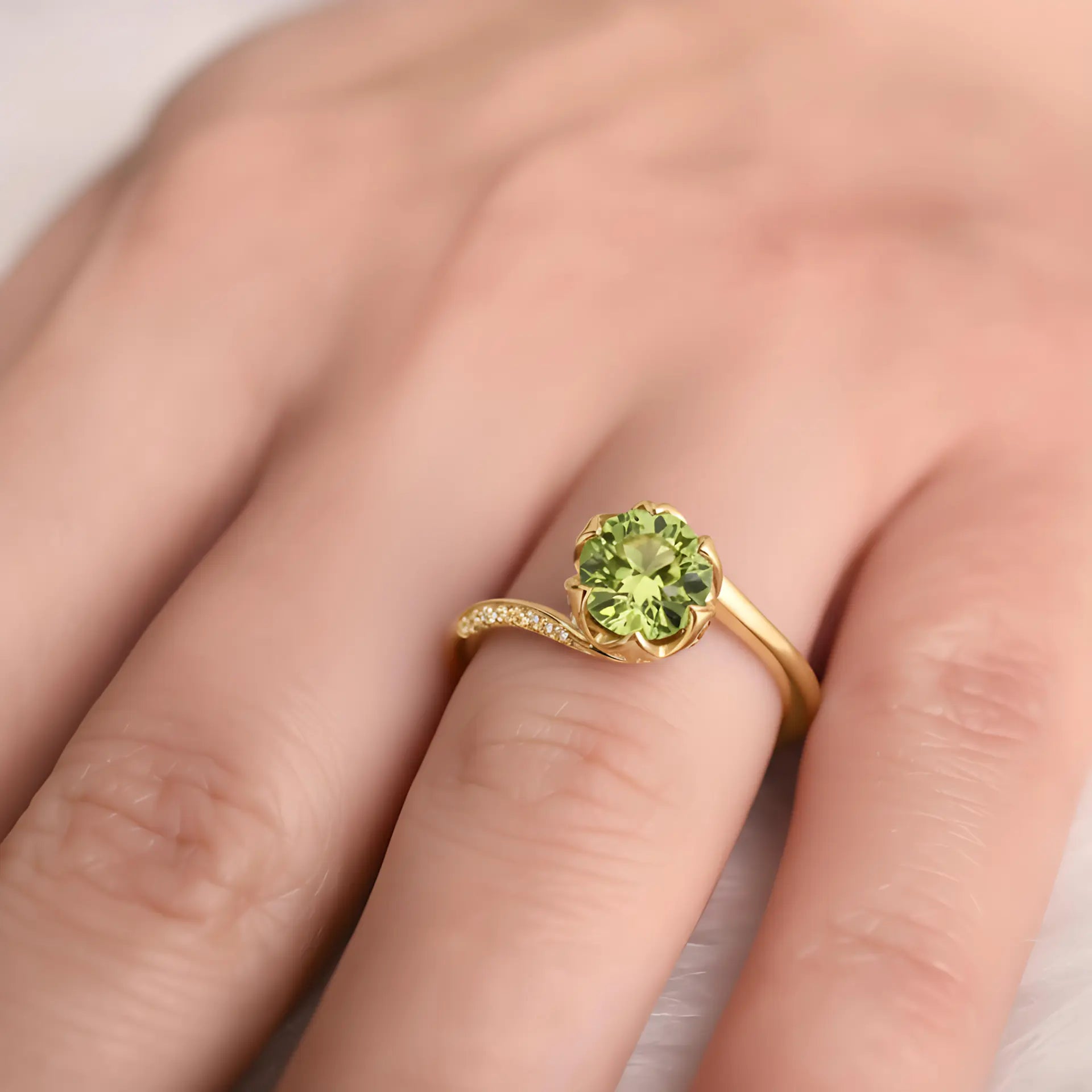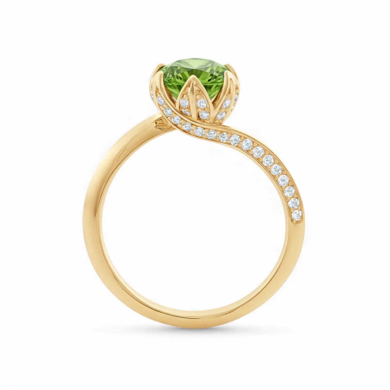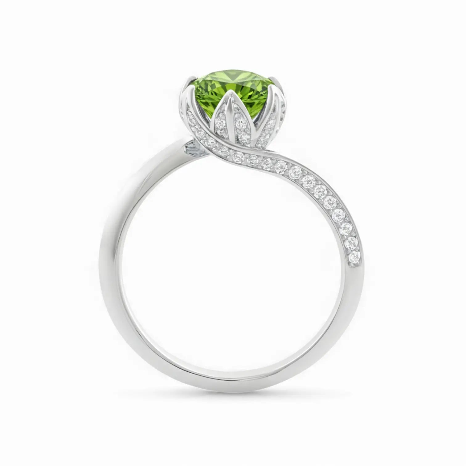 In our Round Peridot Petal Prong Ring, the clear, bright green displays a pure and sharp brilliance under light. The color feels fresh yet carries a rare sense of elegance. Small zircons on one side form a row of fine sparkles. Peridot also stands as the birthstone of August and conveys a gentle sense of empathy. It holds a quiet yet unmistakable presence. It naturally elevates your aura without the need for extra words.
