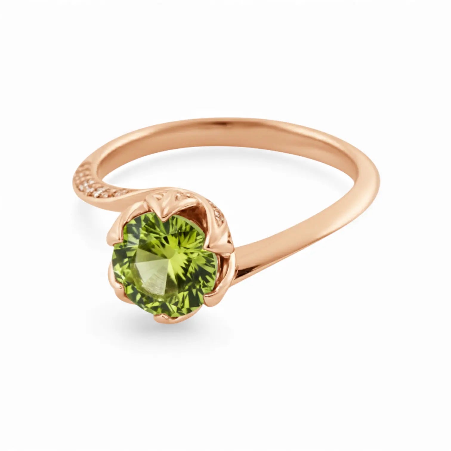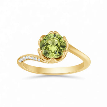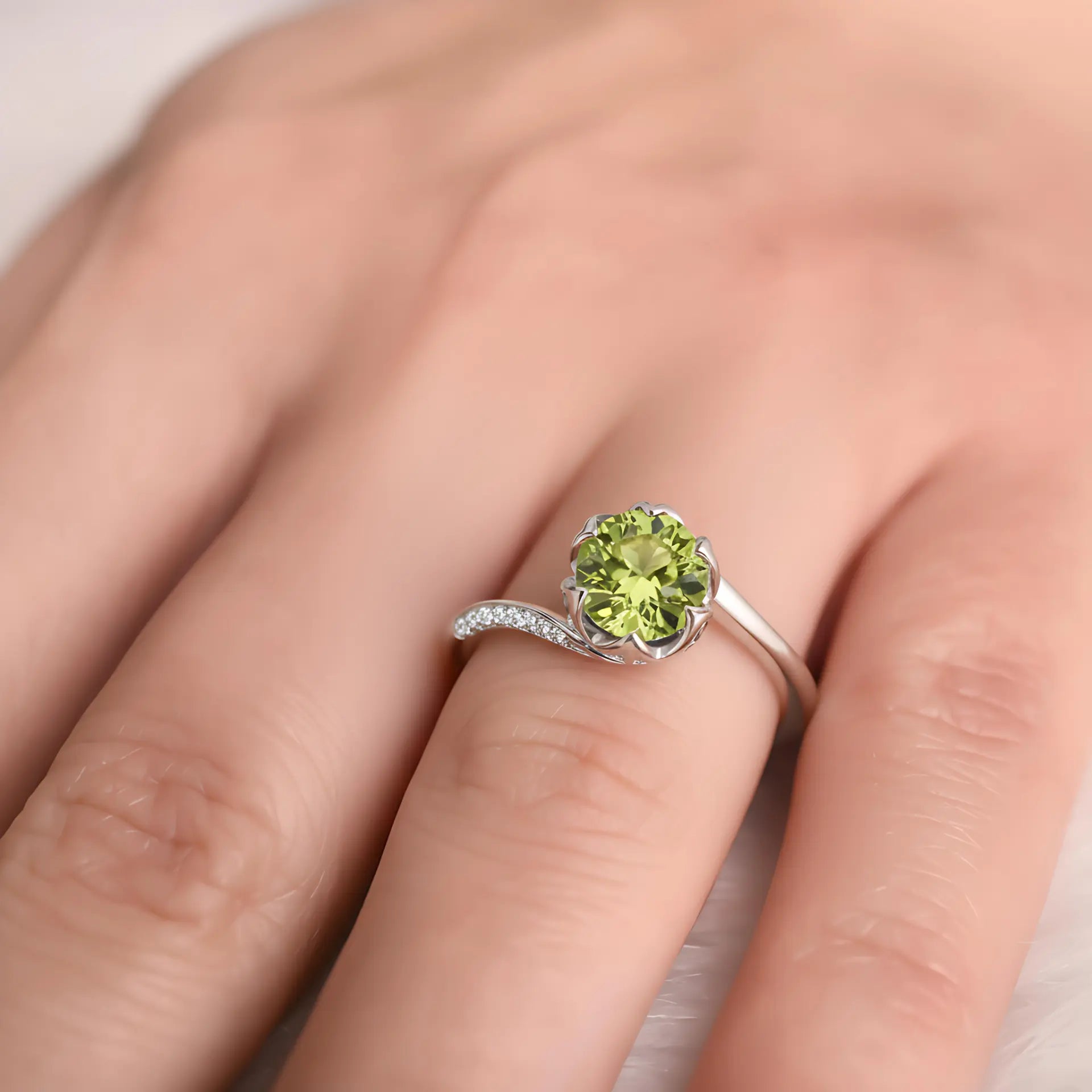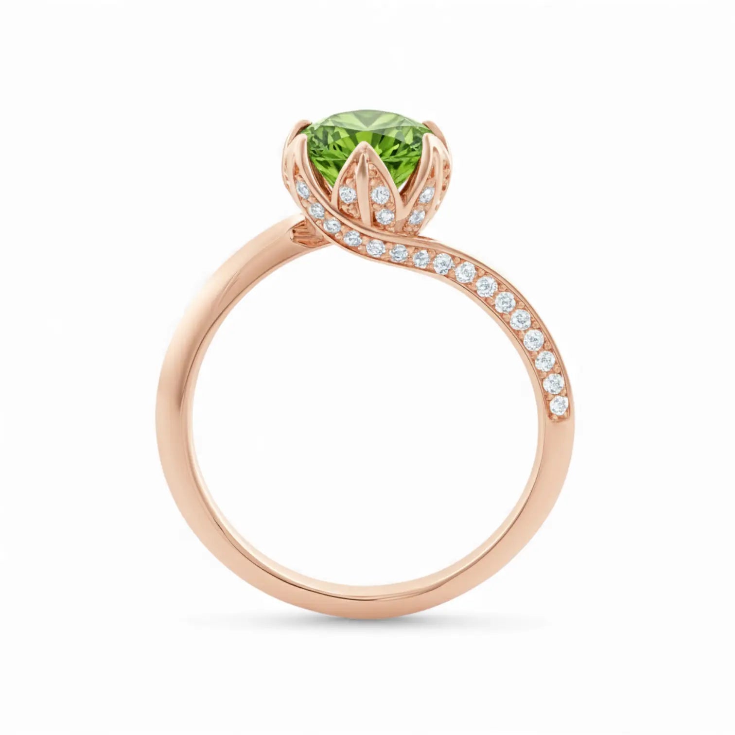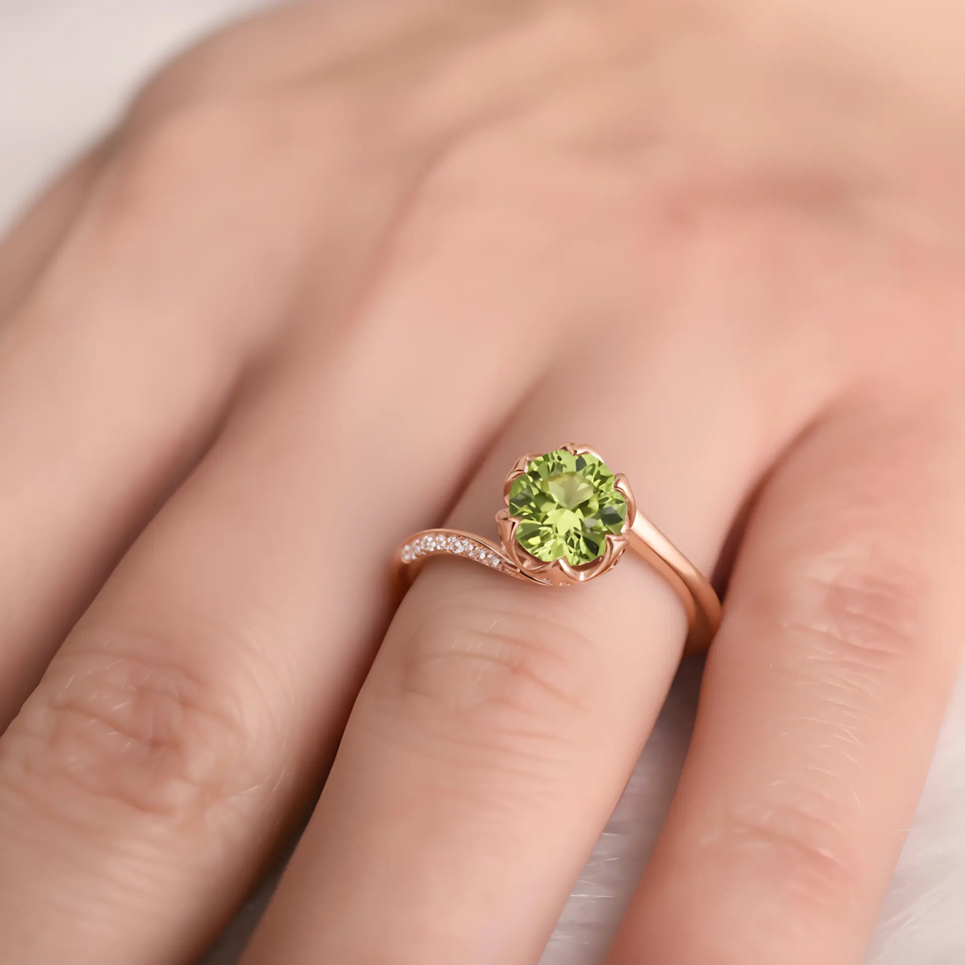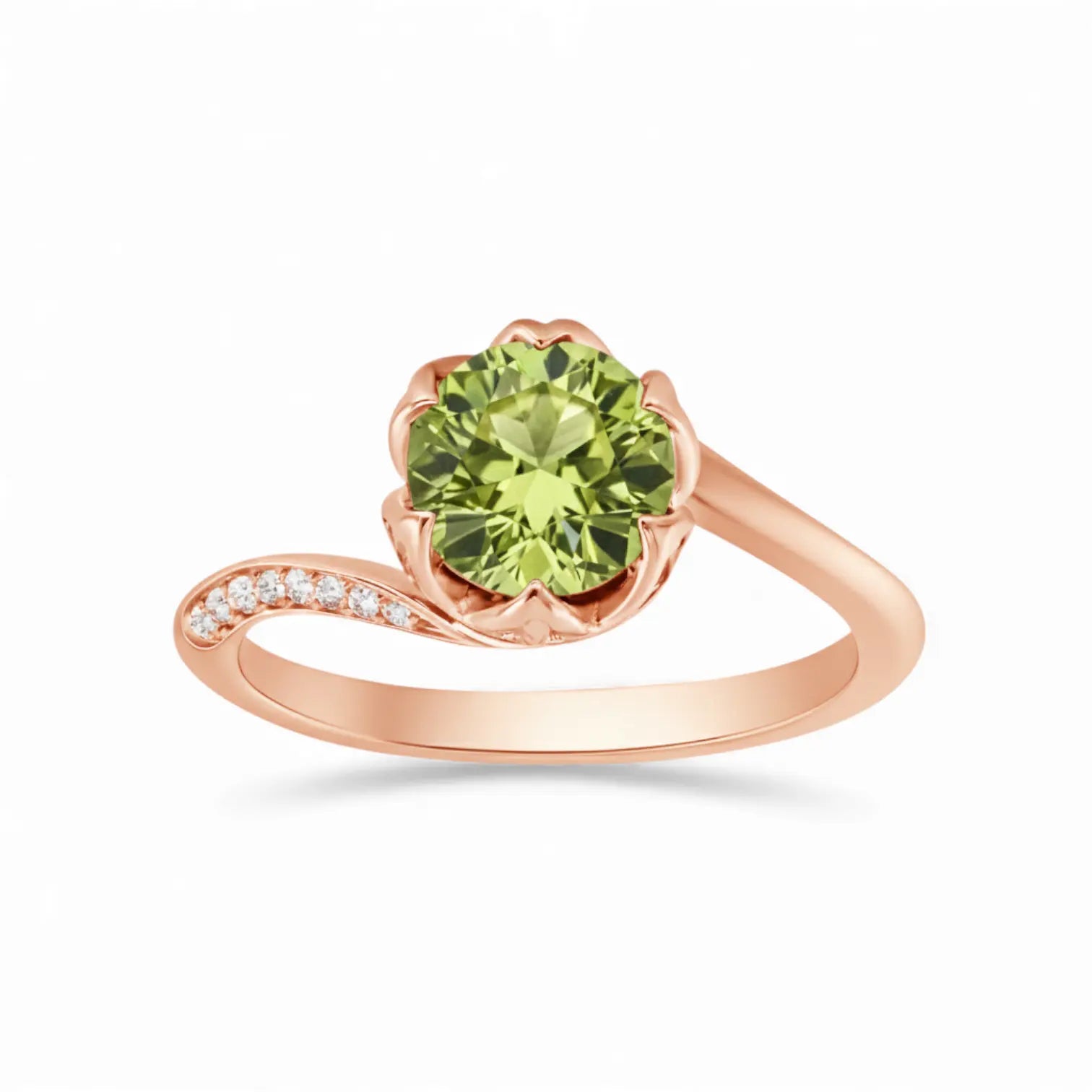 In our Round Peridot Petal Prong Ring, the clear, bright green displays a pure and sharp brilliance under light. The color feels fresh yet carries a rare sense of elegance. Small zircons on one side form a row of fine sparkles. Peridot also stands as the birthstone of August and conveys a gentle sense of empathy. It holds a quiet yet unmistakable presence. It naturally elevates your aura without the need for extra words.