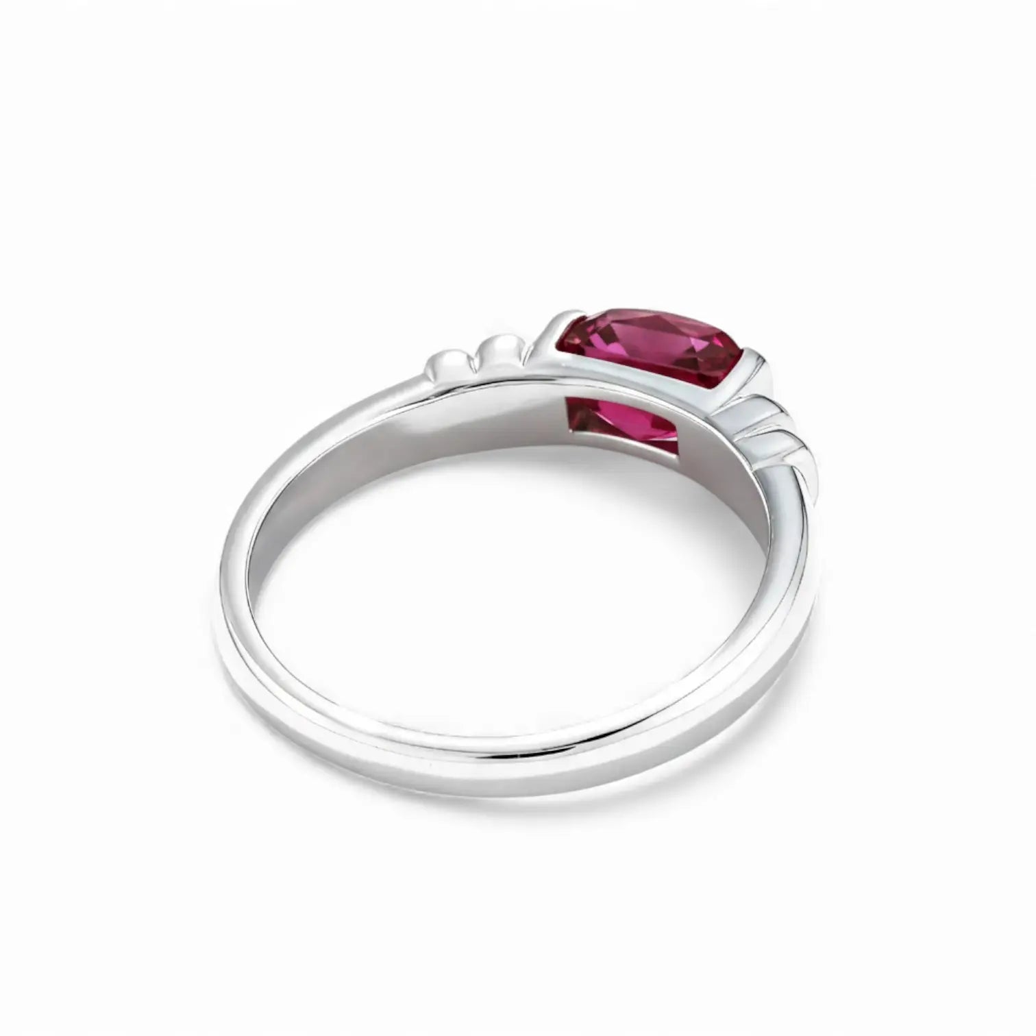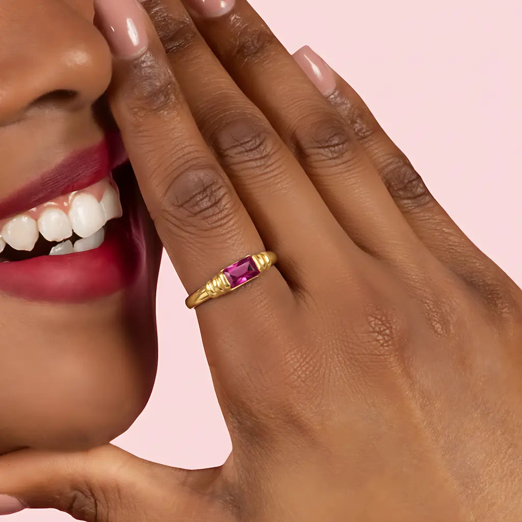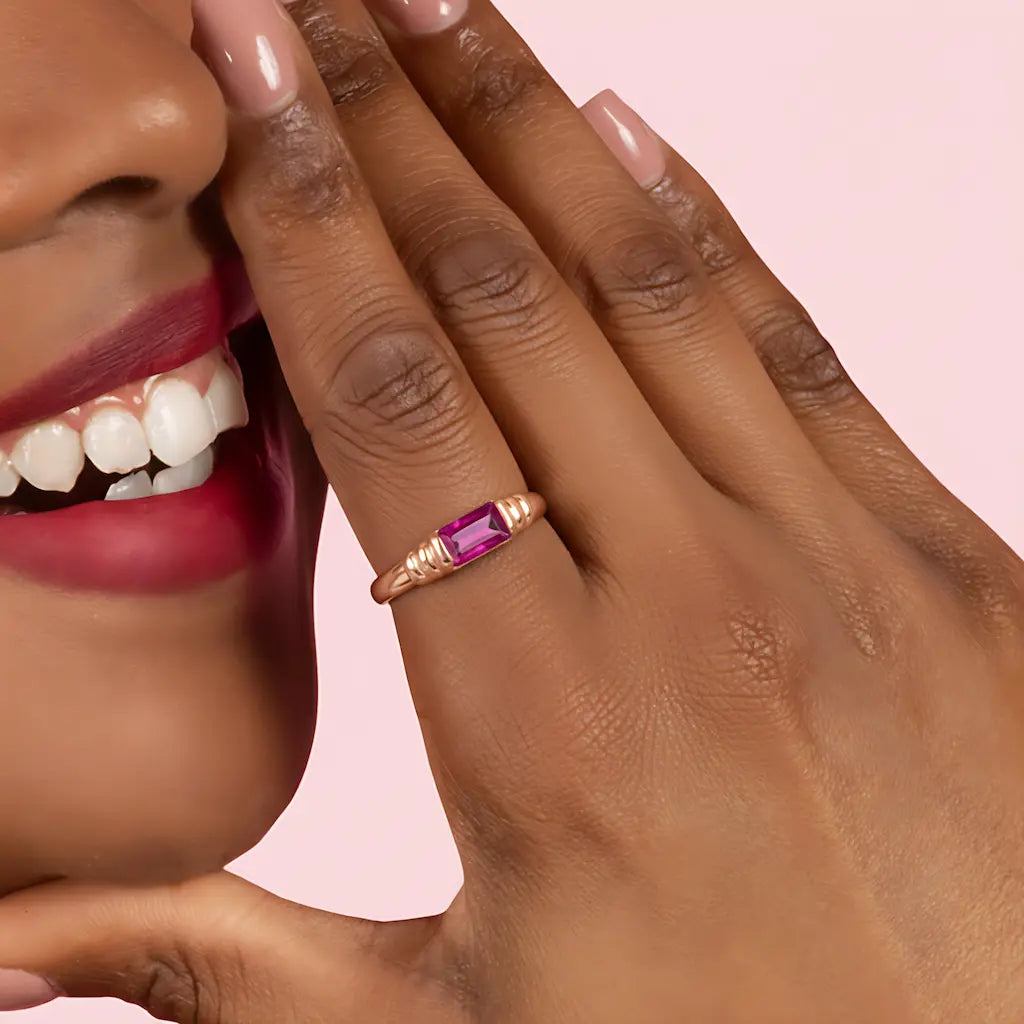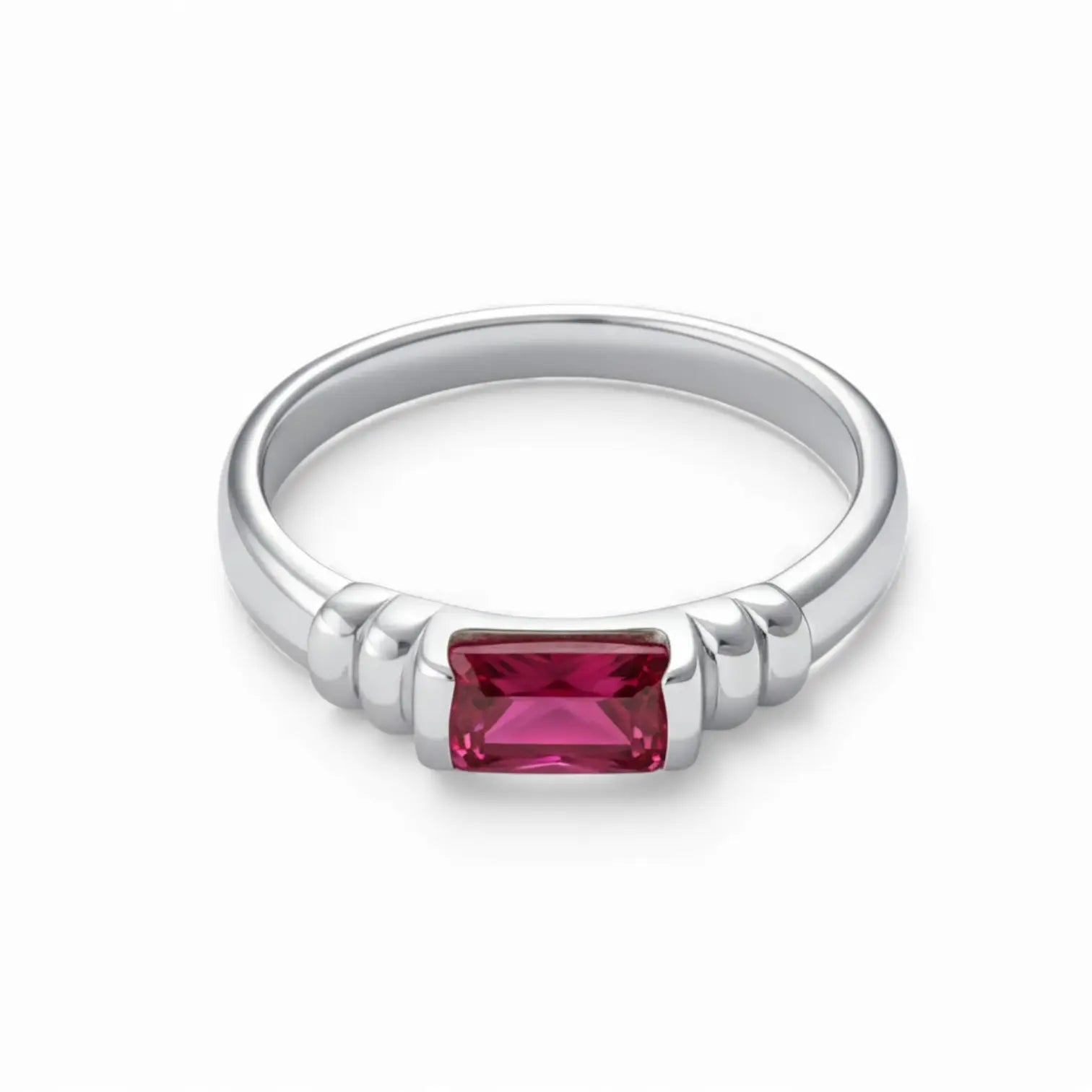 This ruby ring symbolizes the vitality of July, its inner radiance deep and fiery. A baguette gemstone is set in the smooth, balanced band. The clean, crisp lines give the ruby ample space to shine, allowing its brilliance to bloom fully. Wearing this ruby ring will fill your days with vitality. Passion doesn't need to be loud; it only needs to be quietly nurtured, gently elevating your spirit.