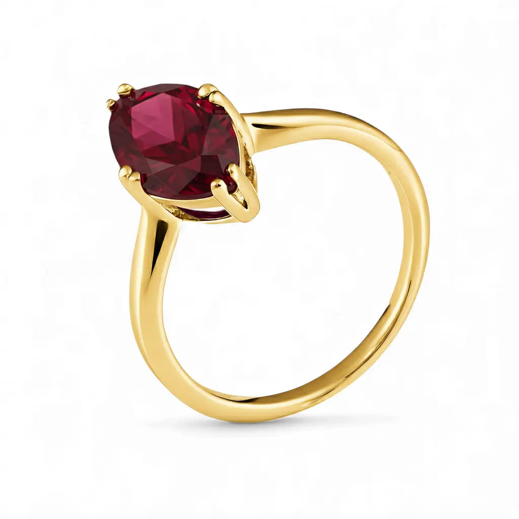 Our Ruby Marquise Ring showcases the deep brilliance of the ruby with a striking marquise cut. The simple, flowing band design accentuates the gem's sharp contours. Wearing it can infuse you with positive energy and awaken your inner passion. It is perfect for days when you need confidence and strength.